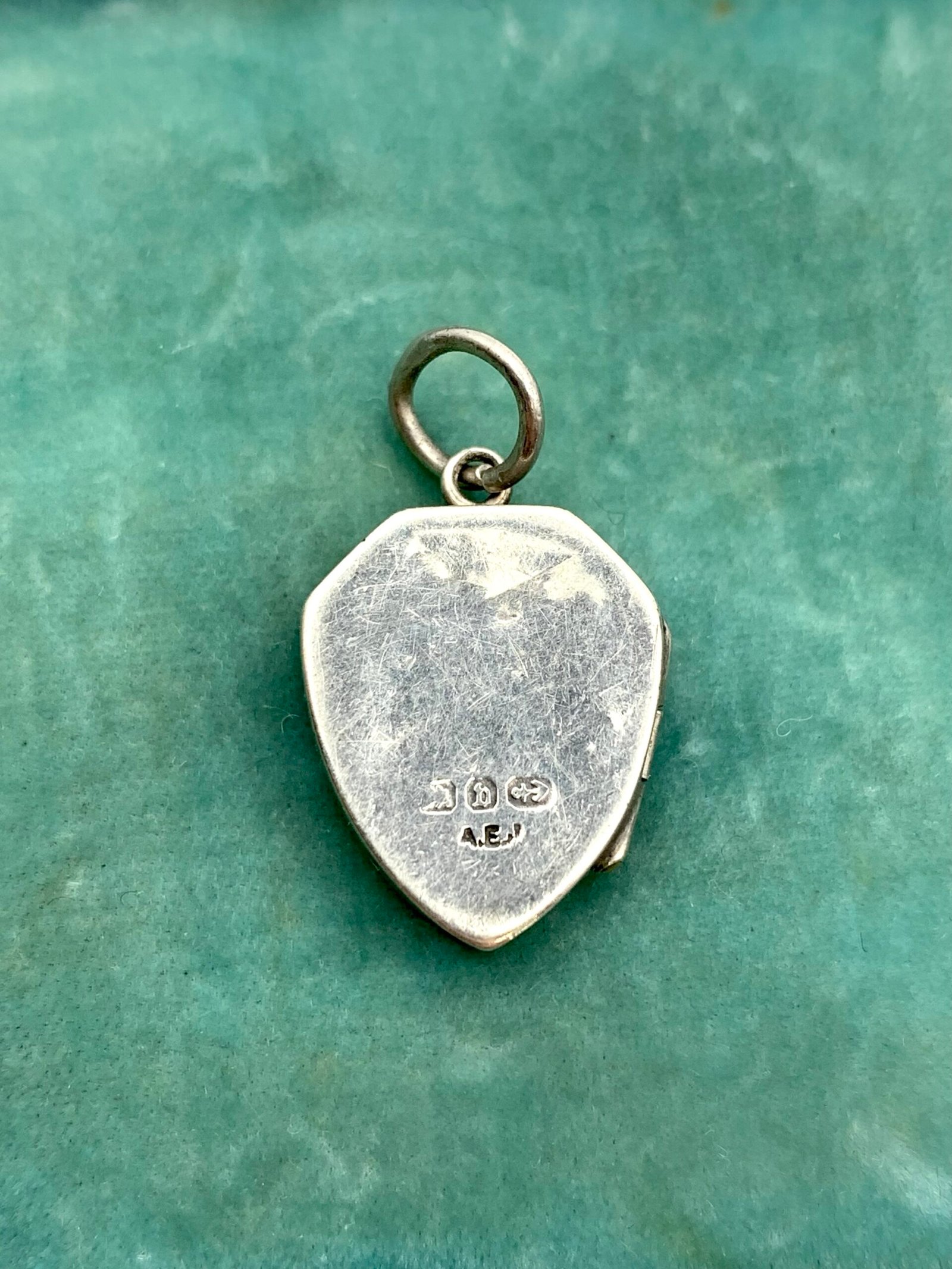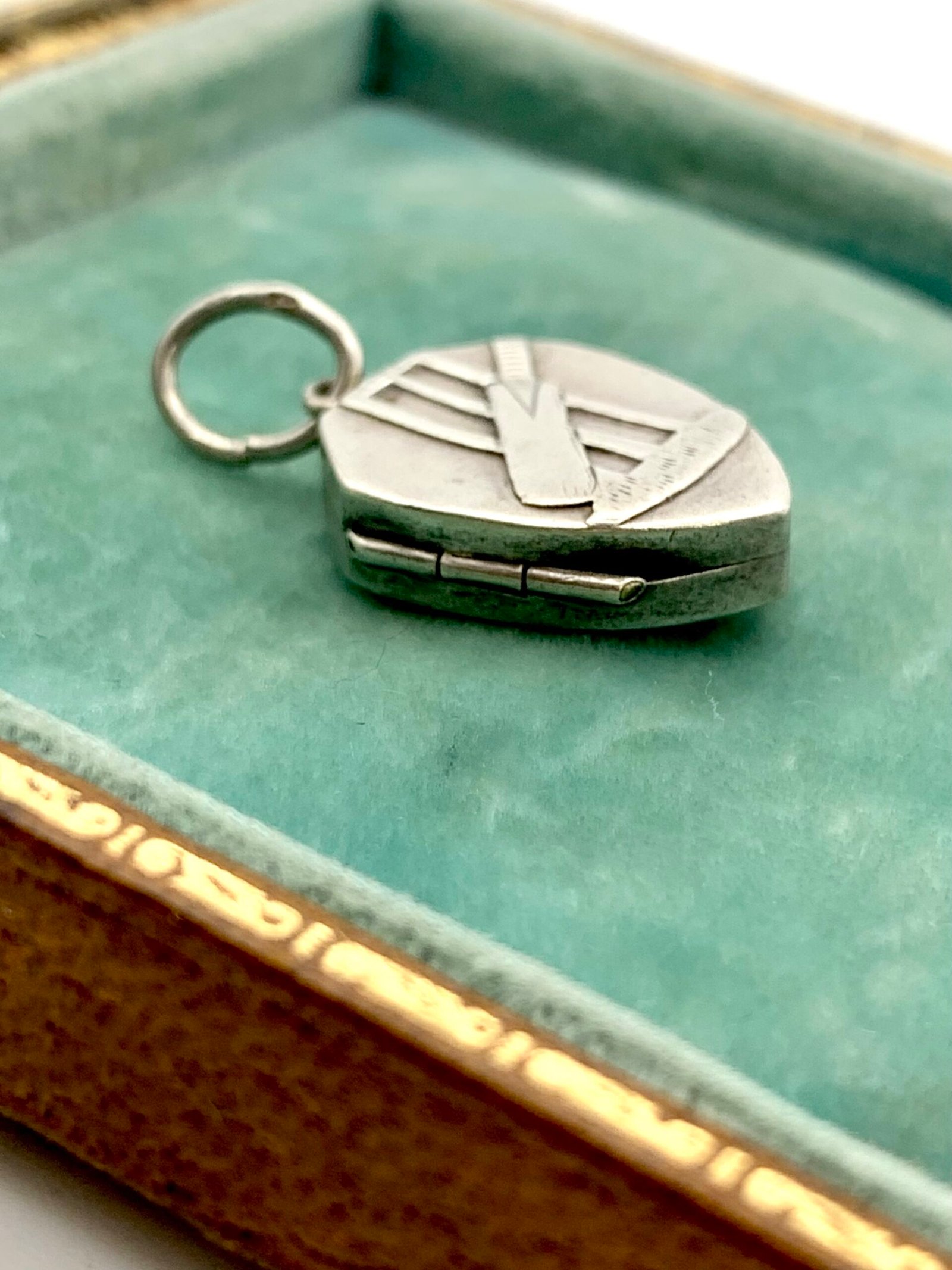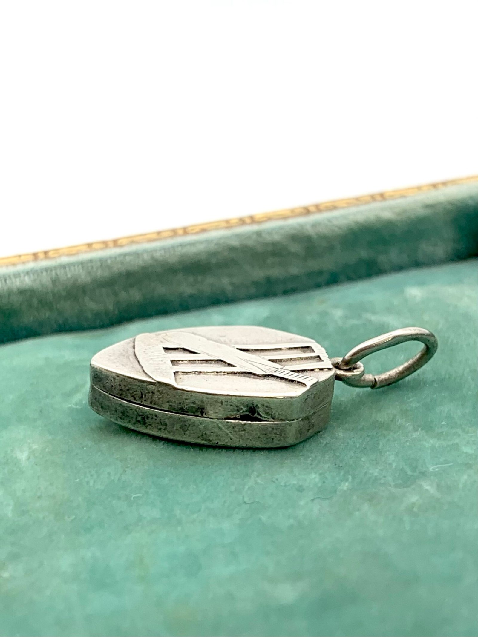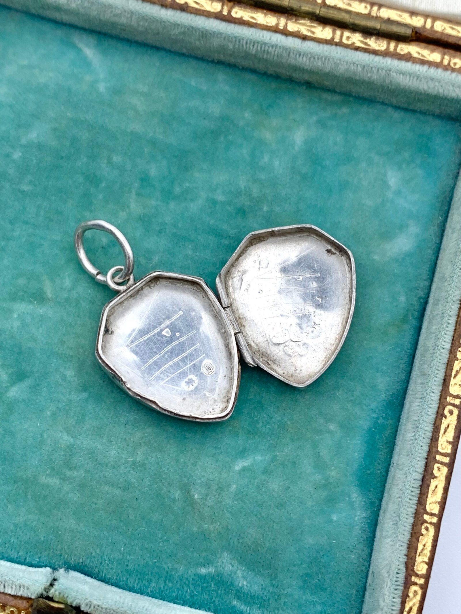 I have had examples of these lockets before – small, with Birmingham hallmarks and applied decoration. Other subjects have included horse riding and marriage. I think the designs could be commissioned by the original customer
