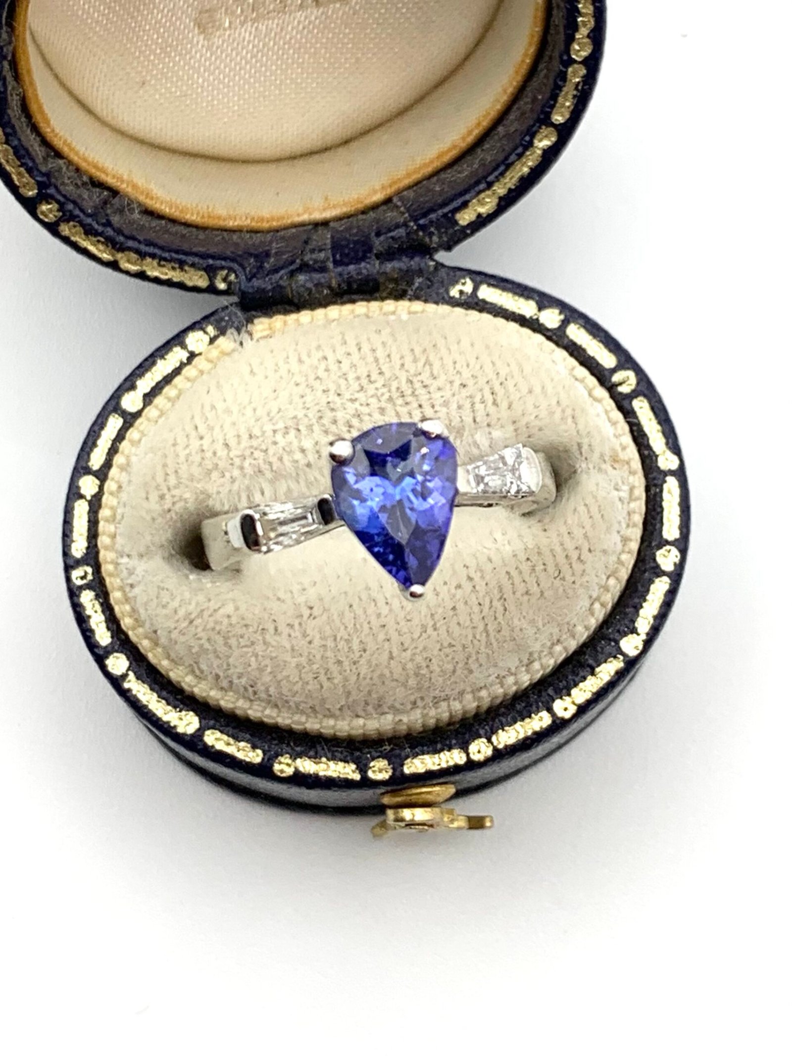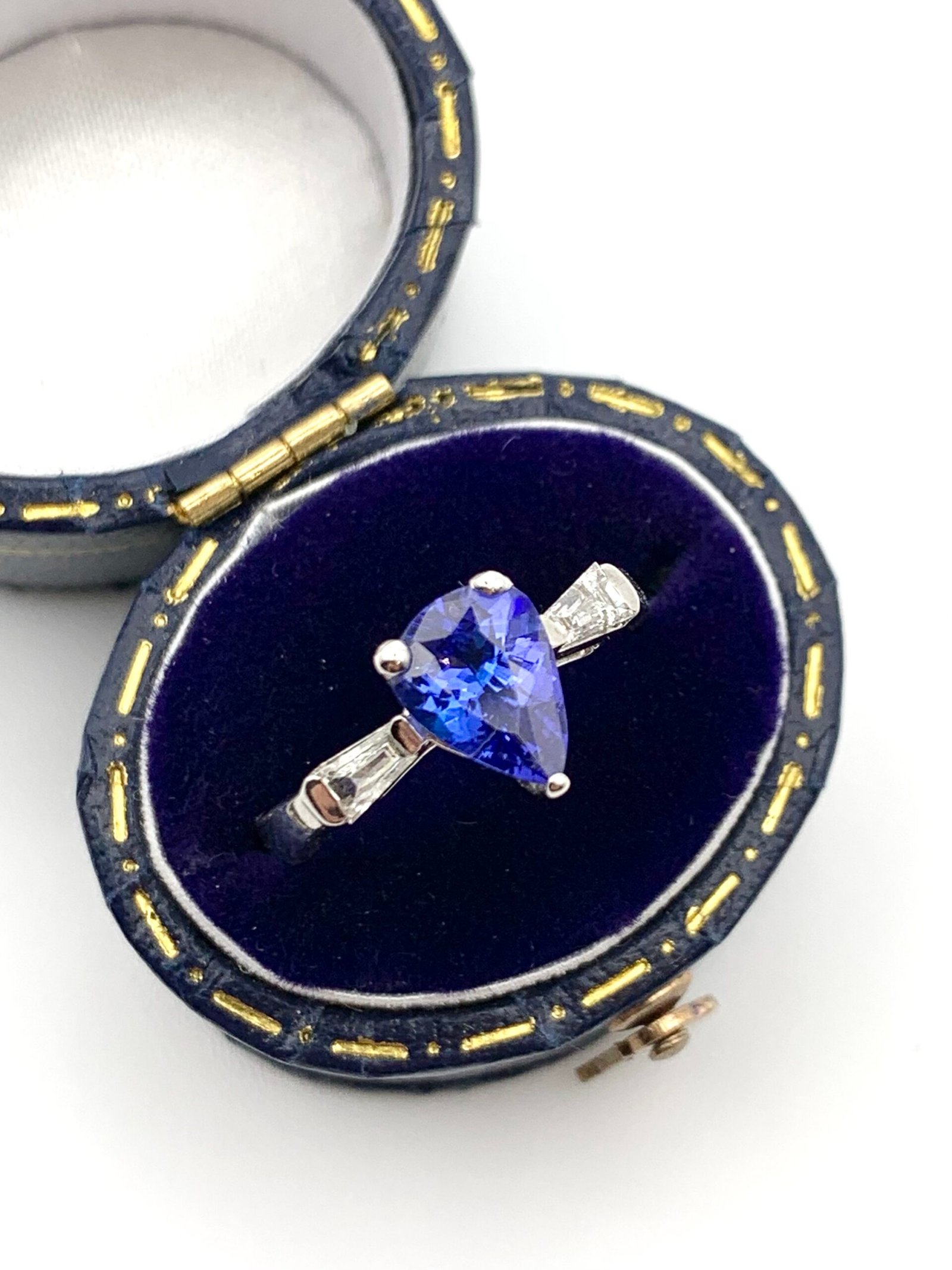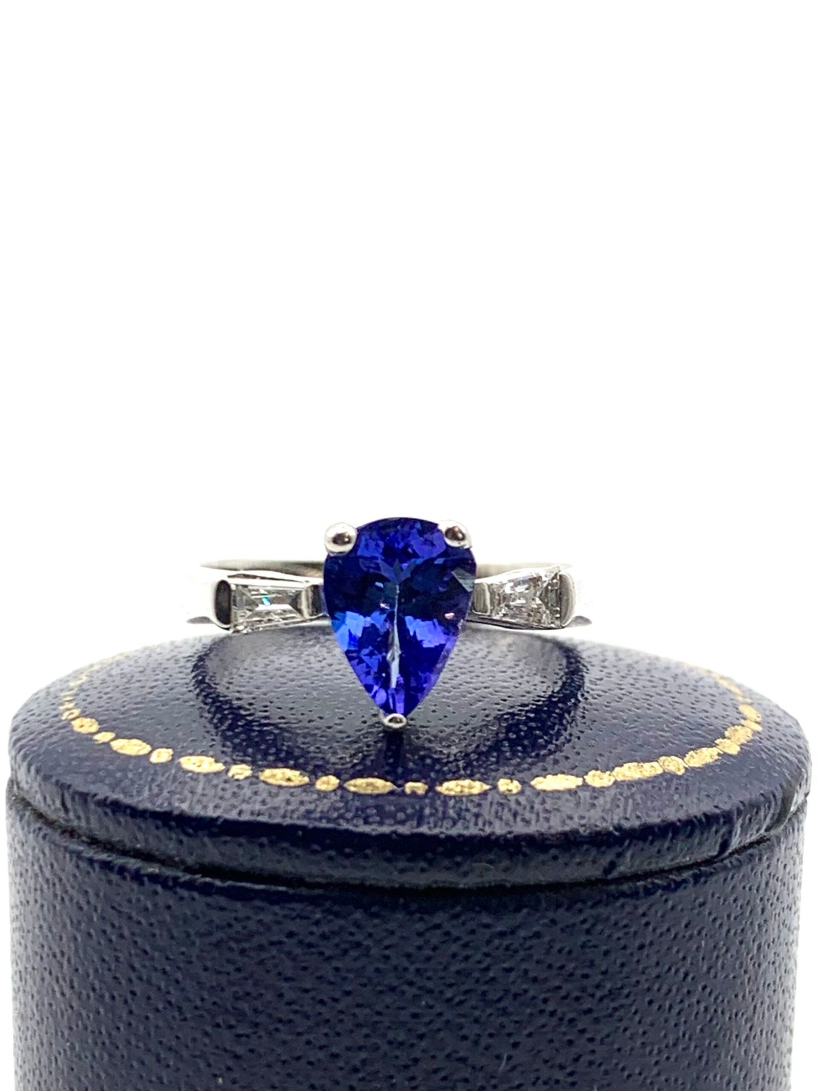 The pear-shape tanzanite measures 8mm x 6mm (approx 0.8 – 0.9ctw)