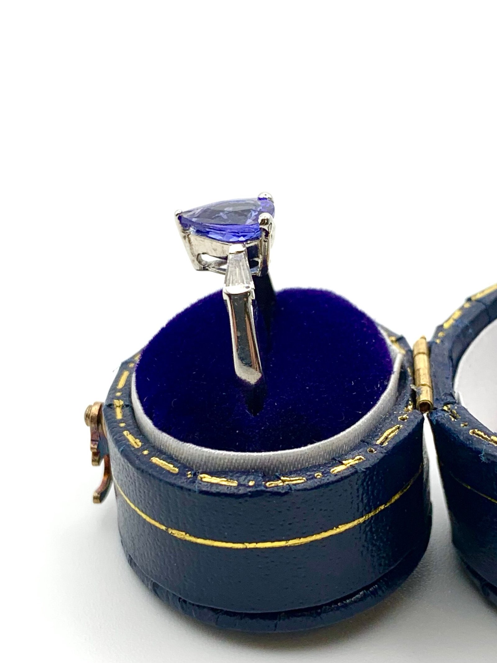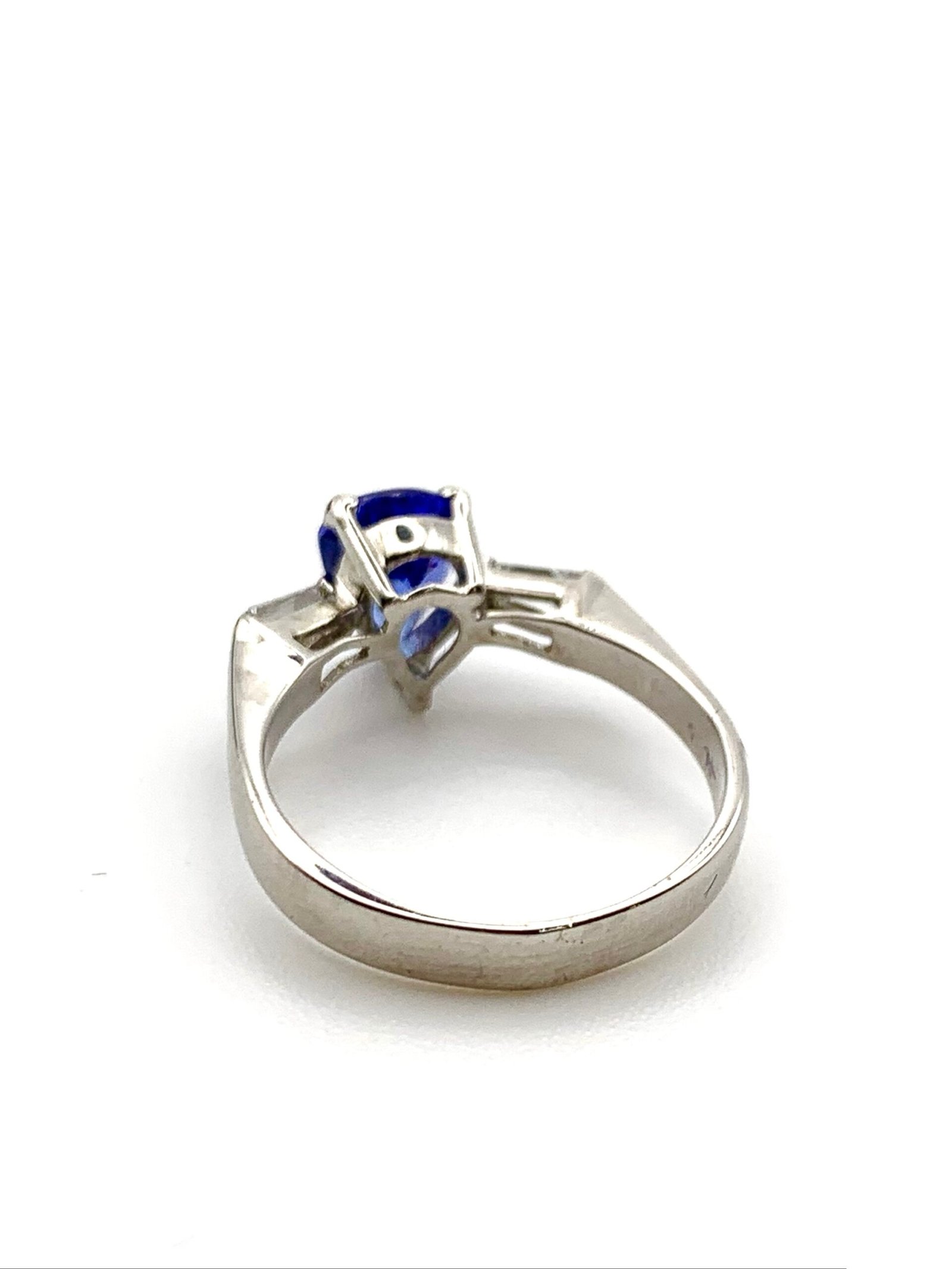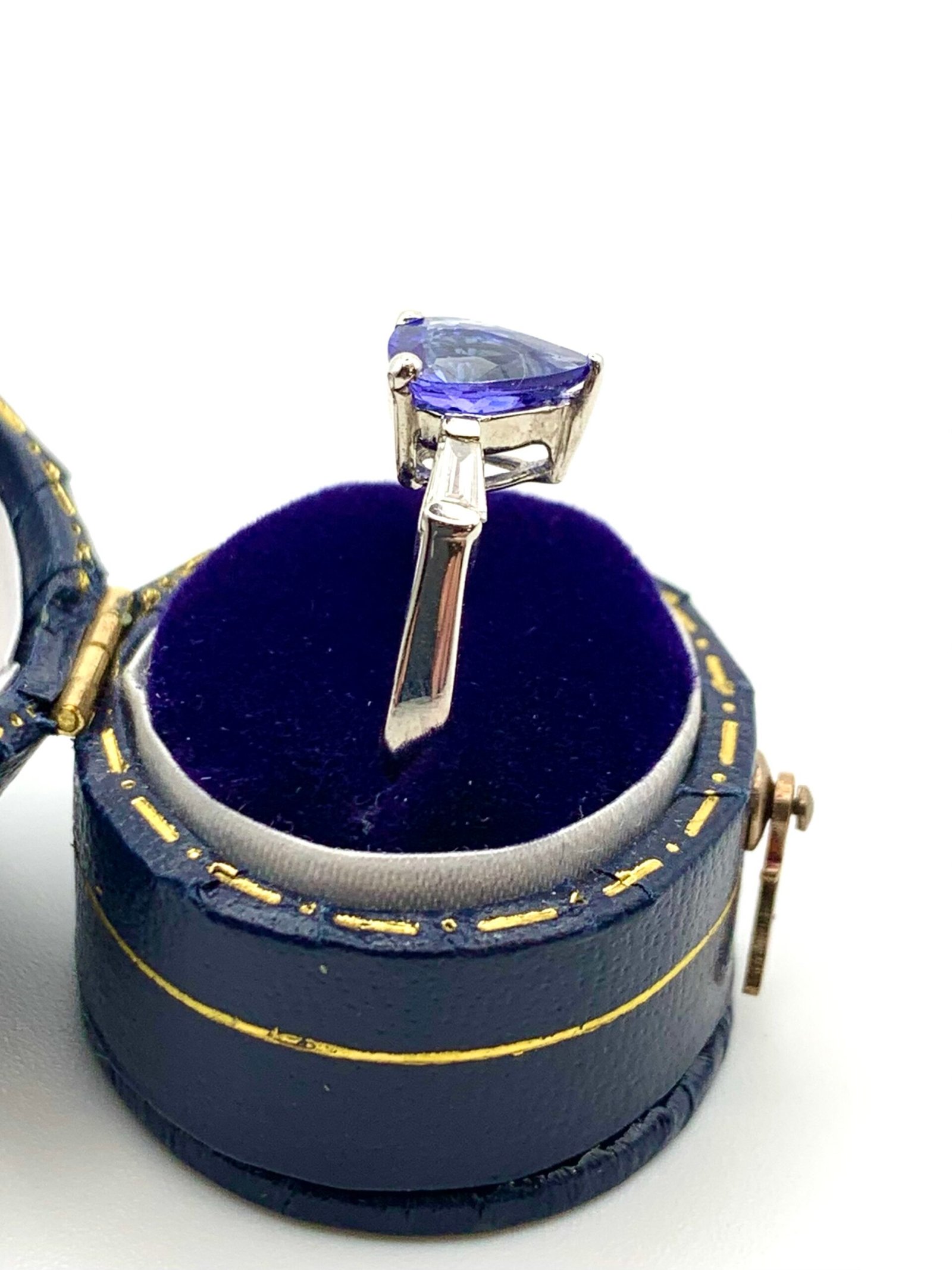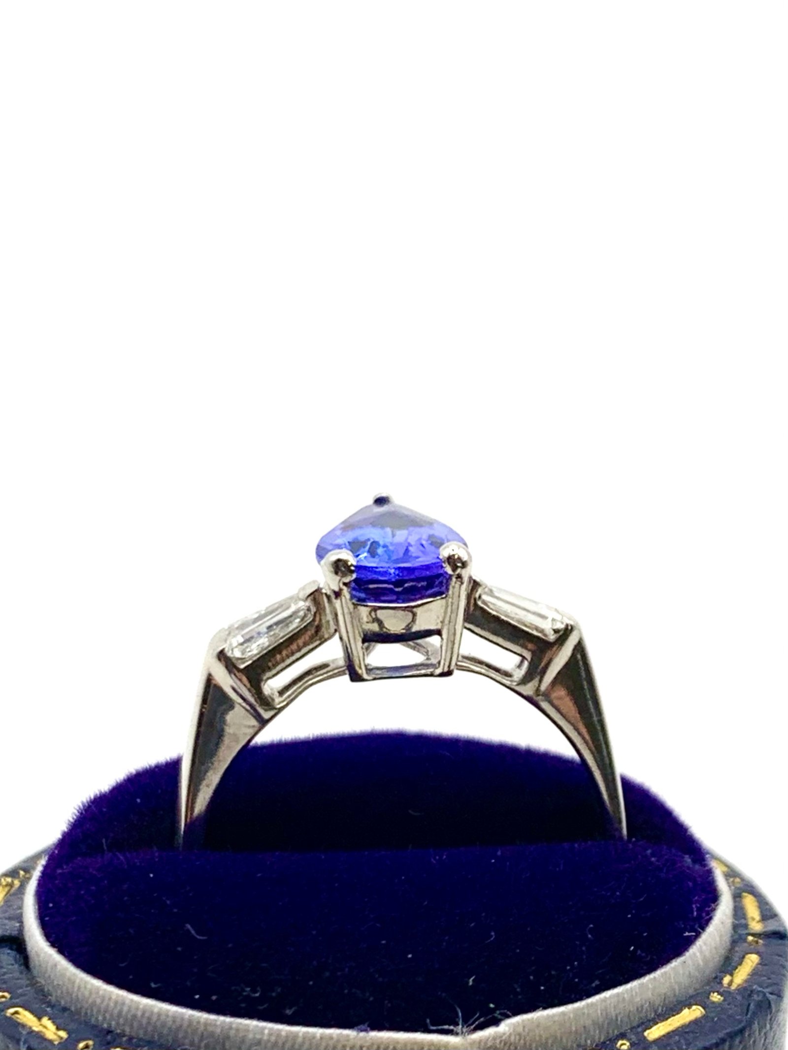 The pear-shape tanzanite measures 8mm x 6mm (approx 0.8 – 0.9ctw)
