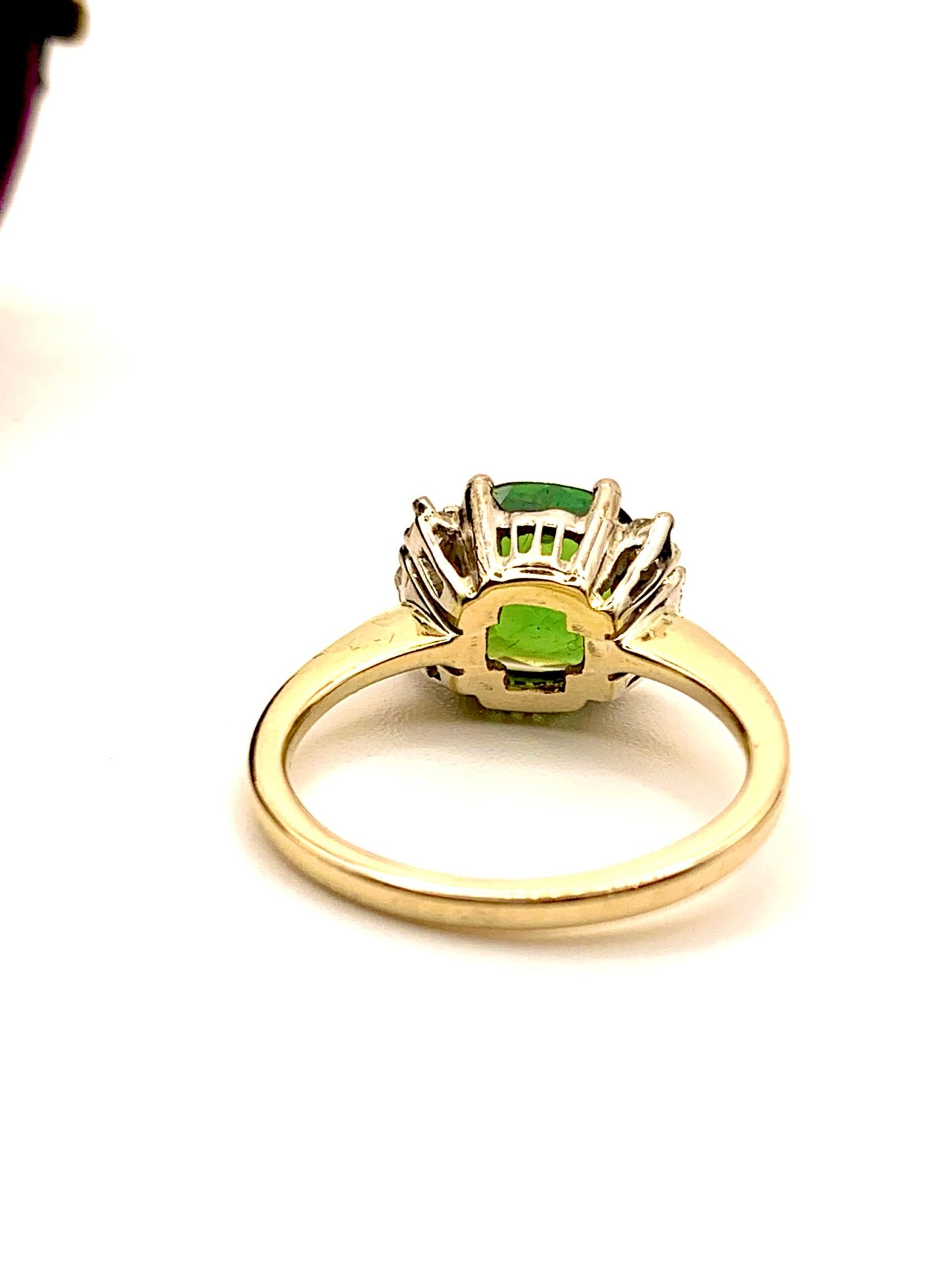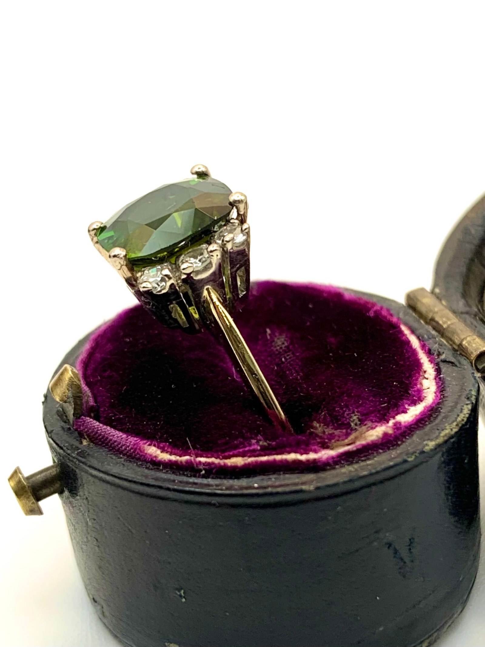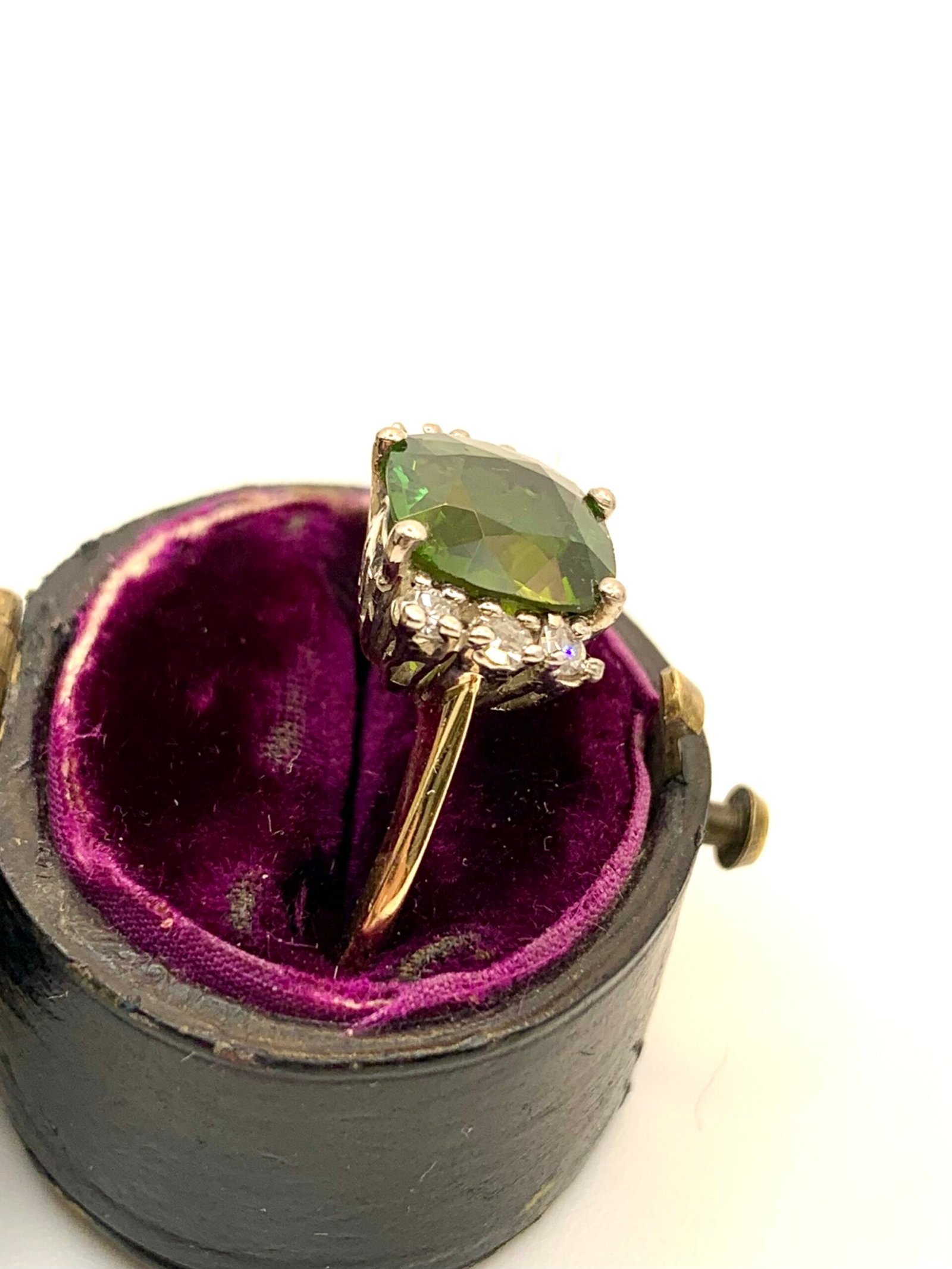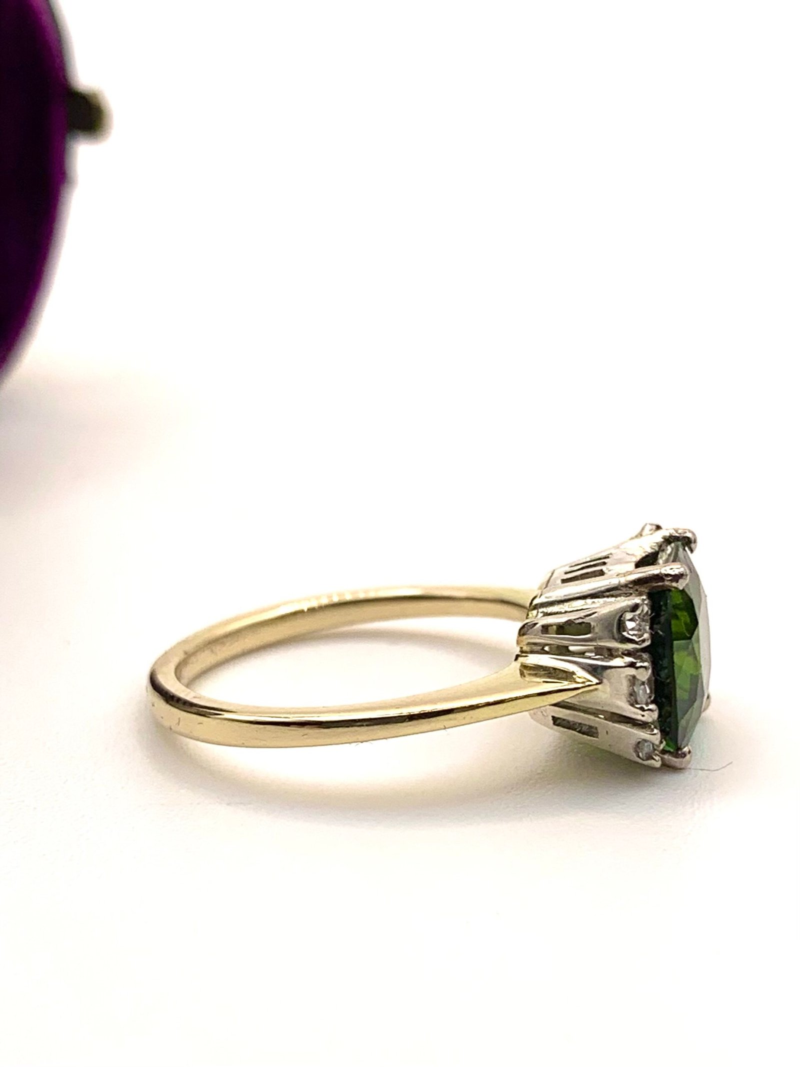 The main stone is a beautiful green tourmaline. It shows two distinct shades – an acidy yellow-green and a lush, black-toned forest green