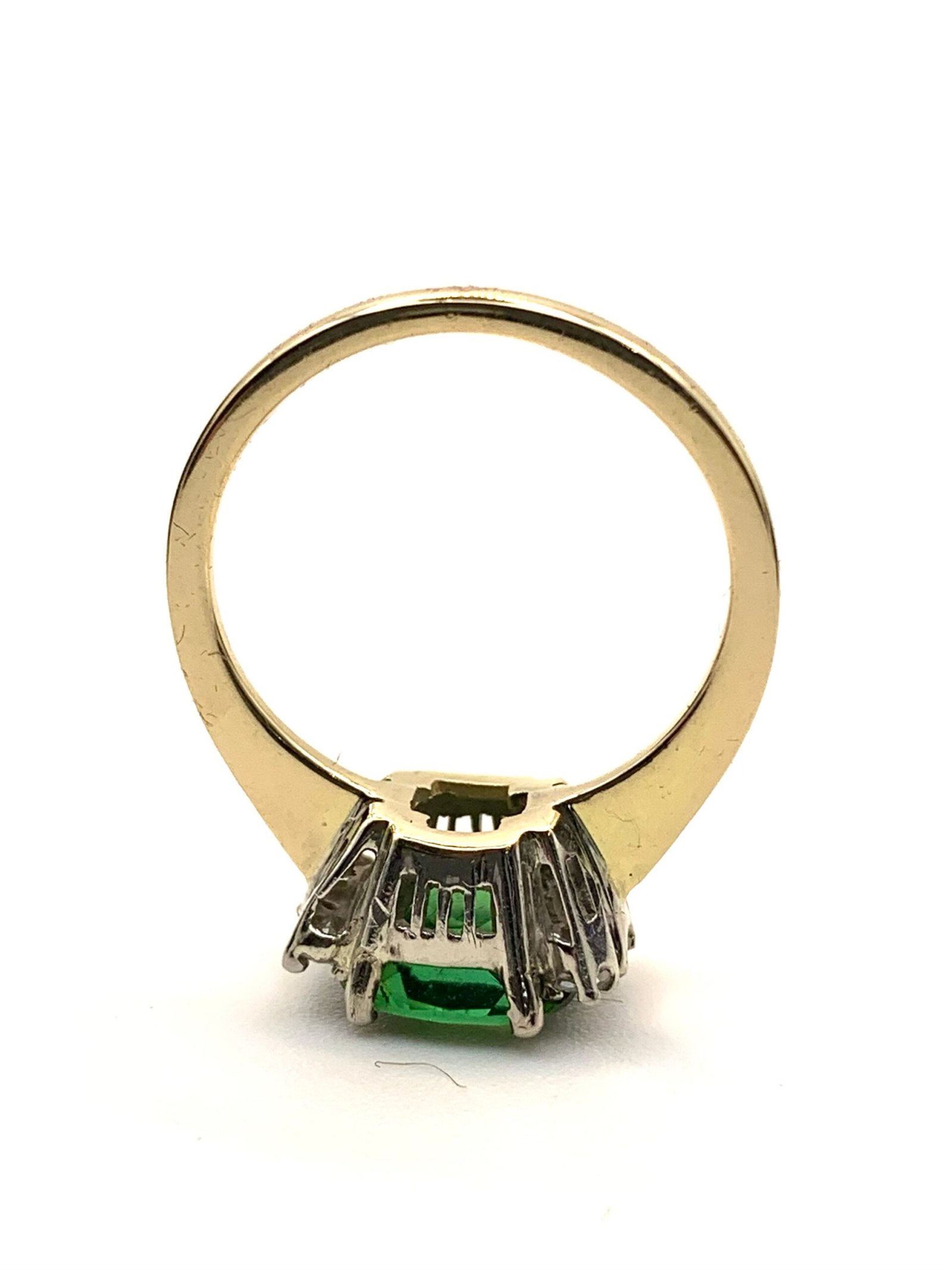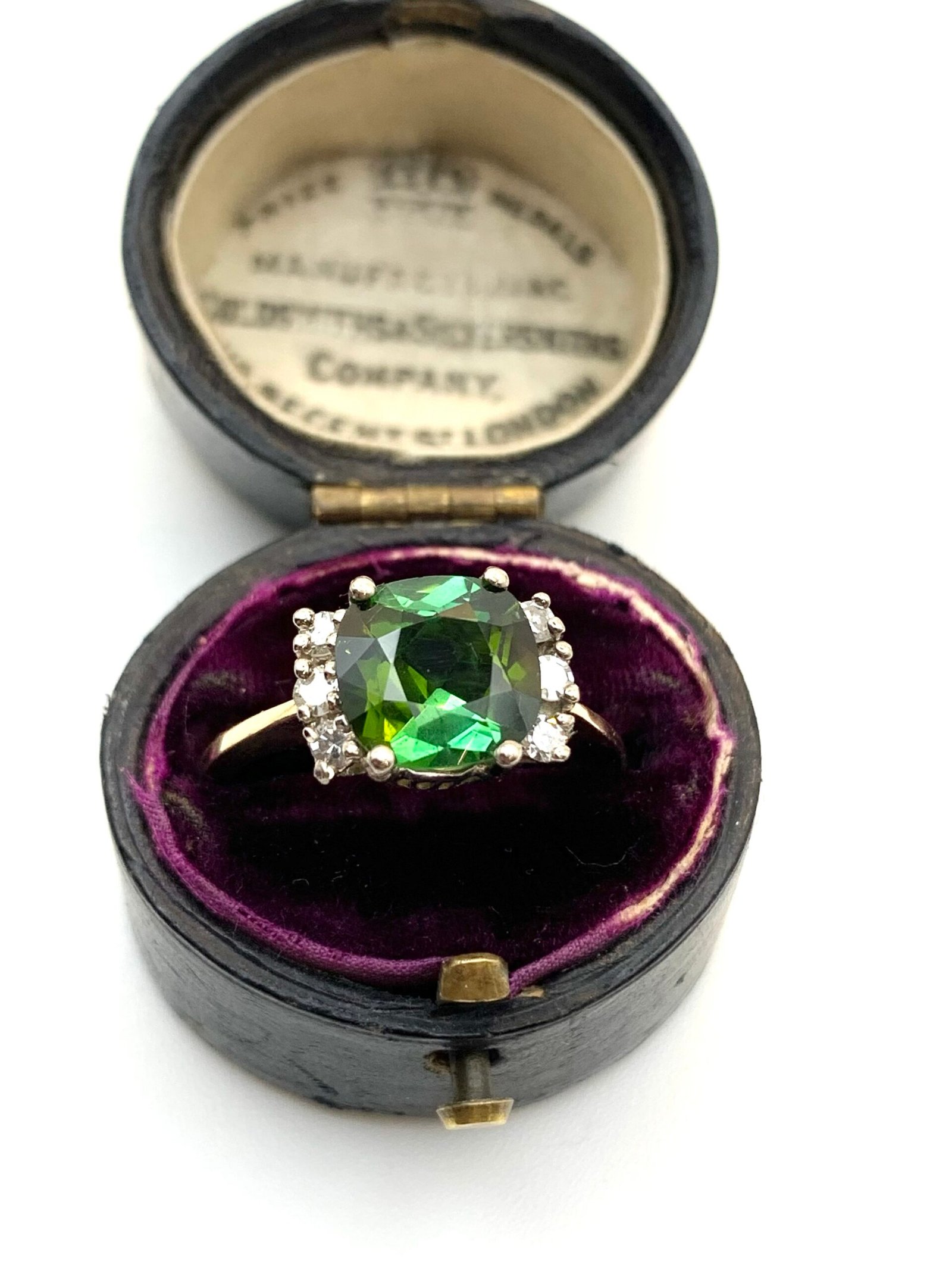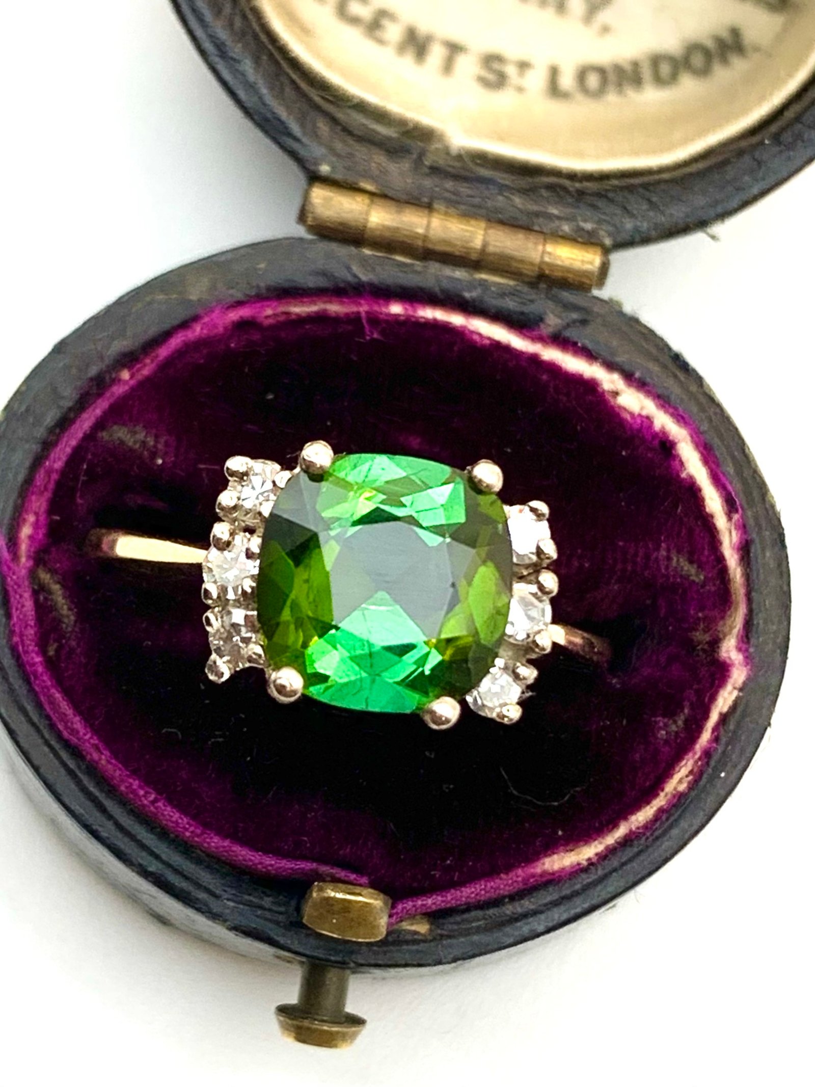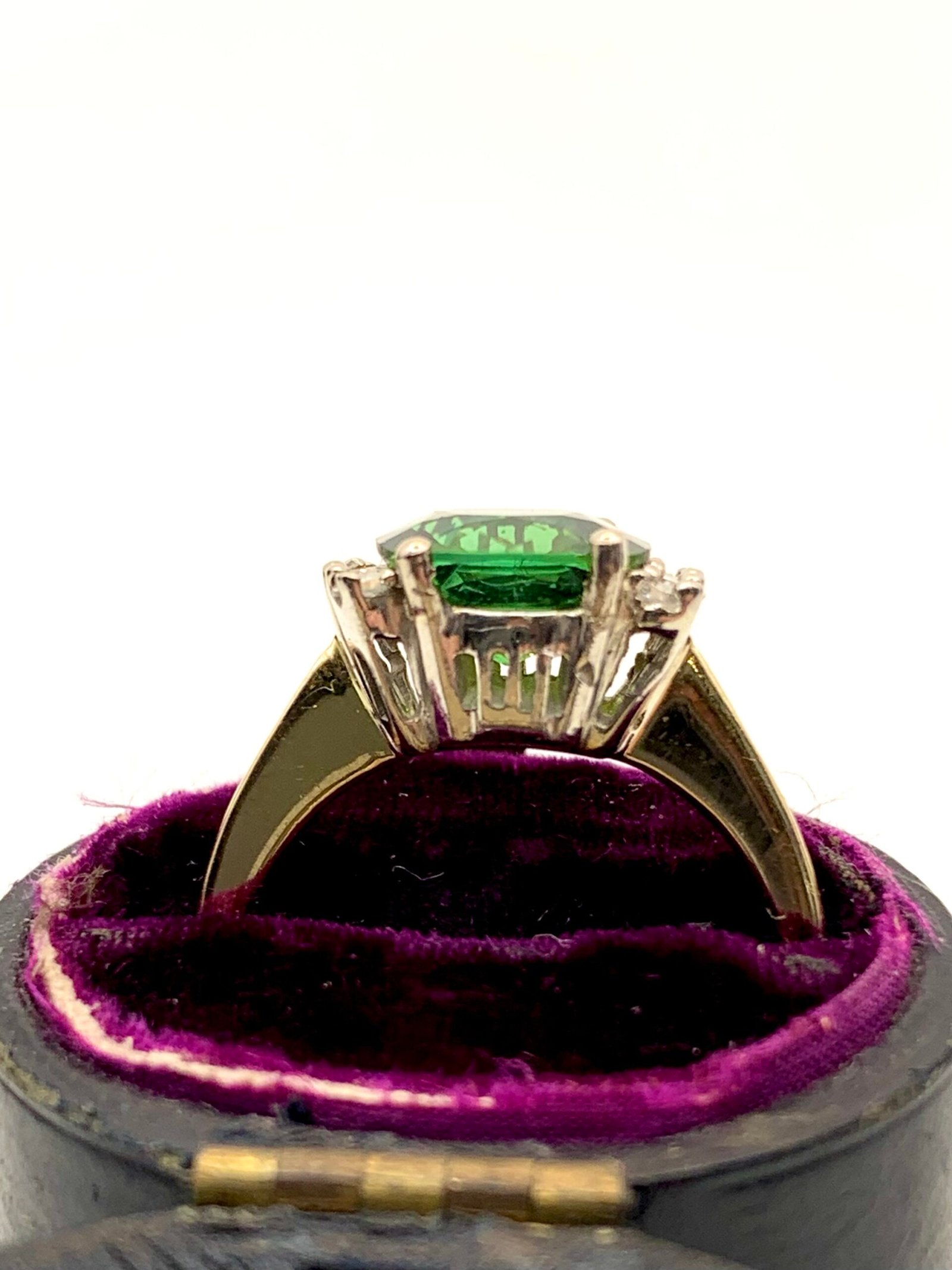 The main stone is a beautiful green tourmaline. It shows two distinct shades – an acidy yellow-green and a lush, black-toned forest green