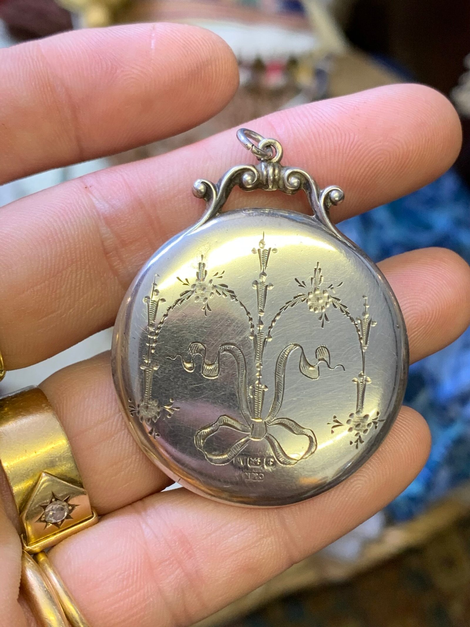 It’s a silver-backed mirror, hand engraved with a ribbon and swags, and fully hallmarked for Birmingham 1921