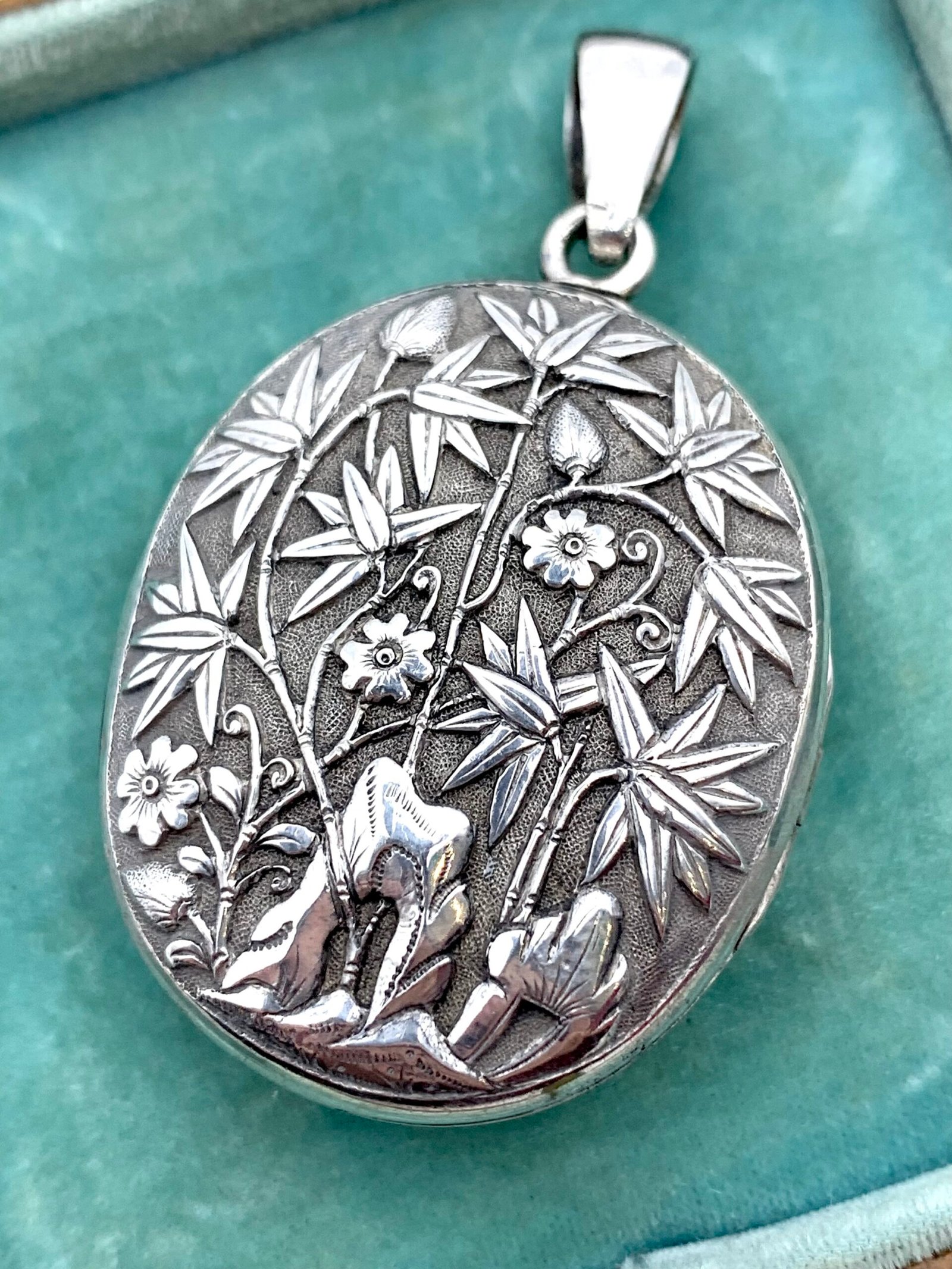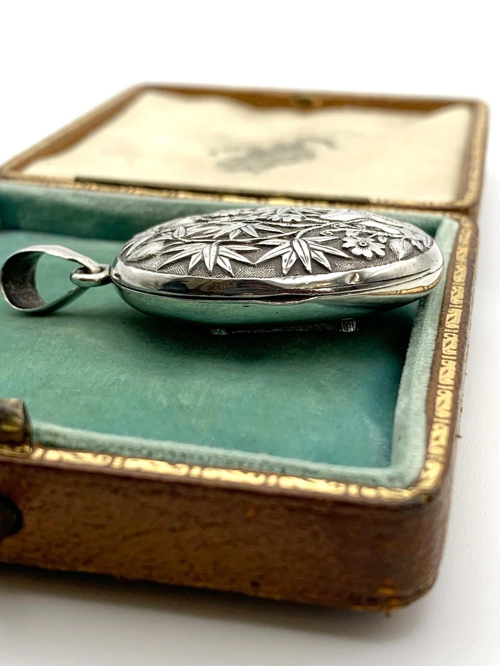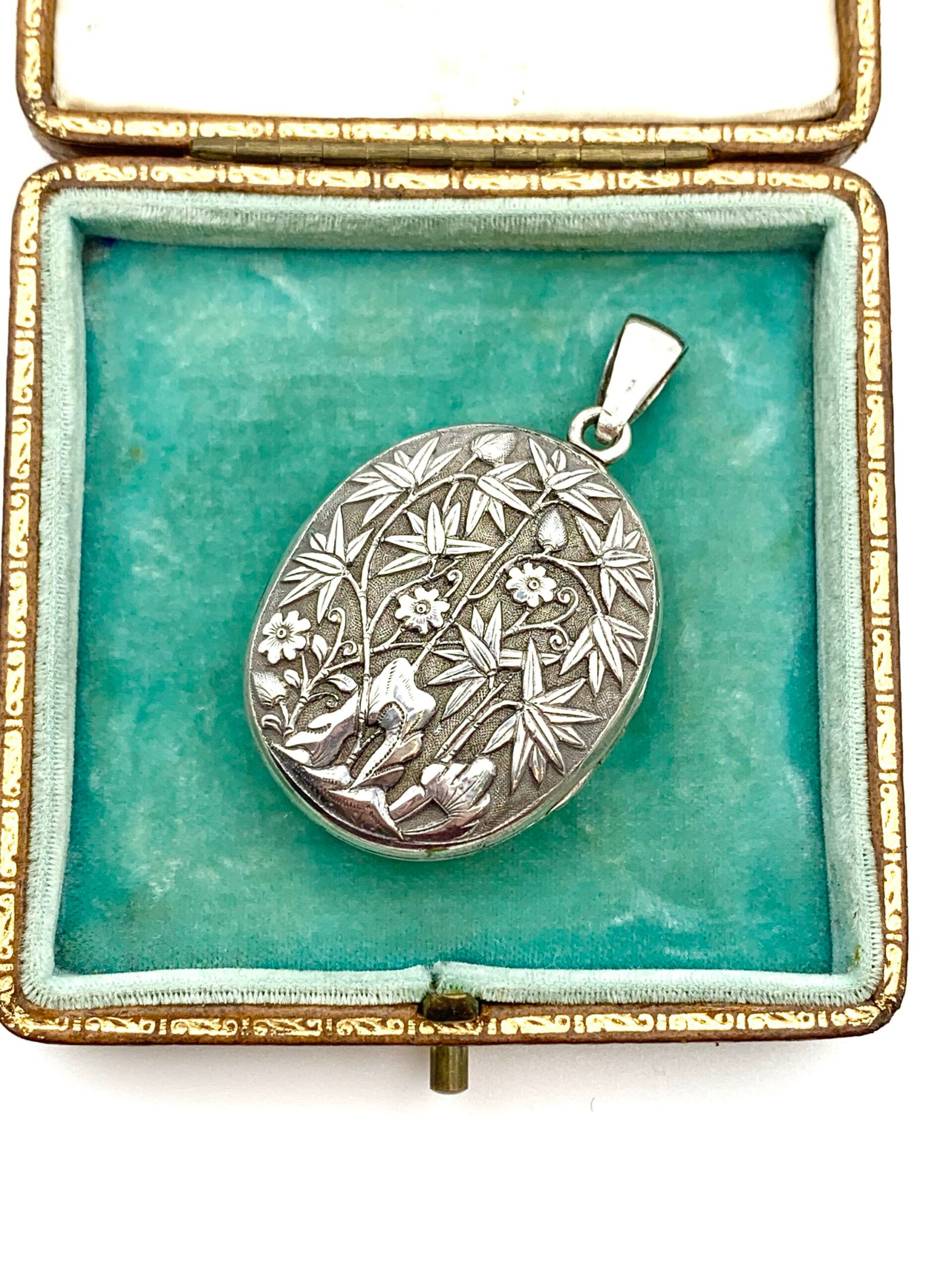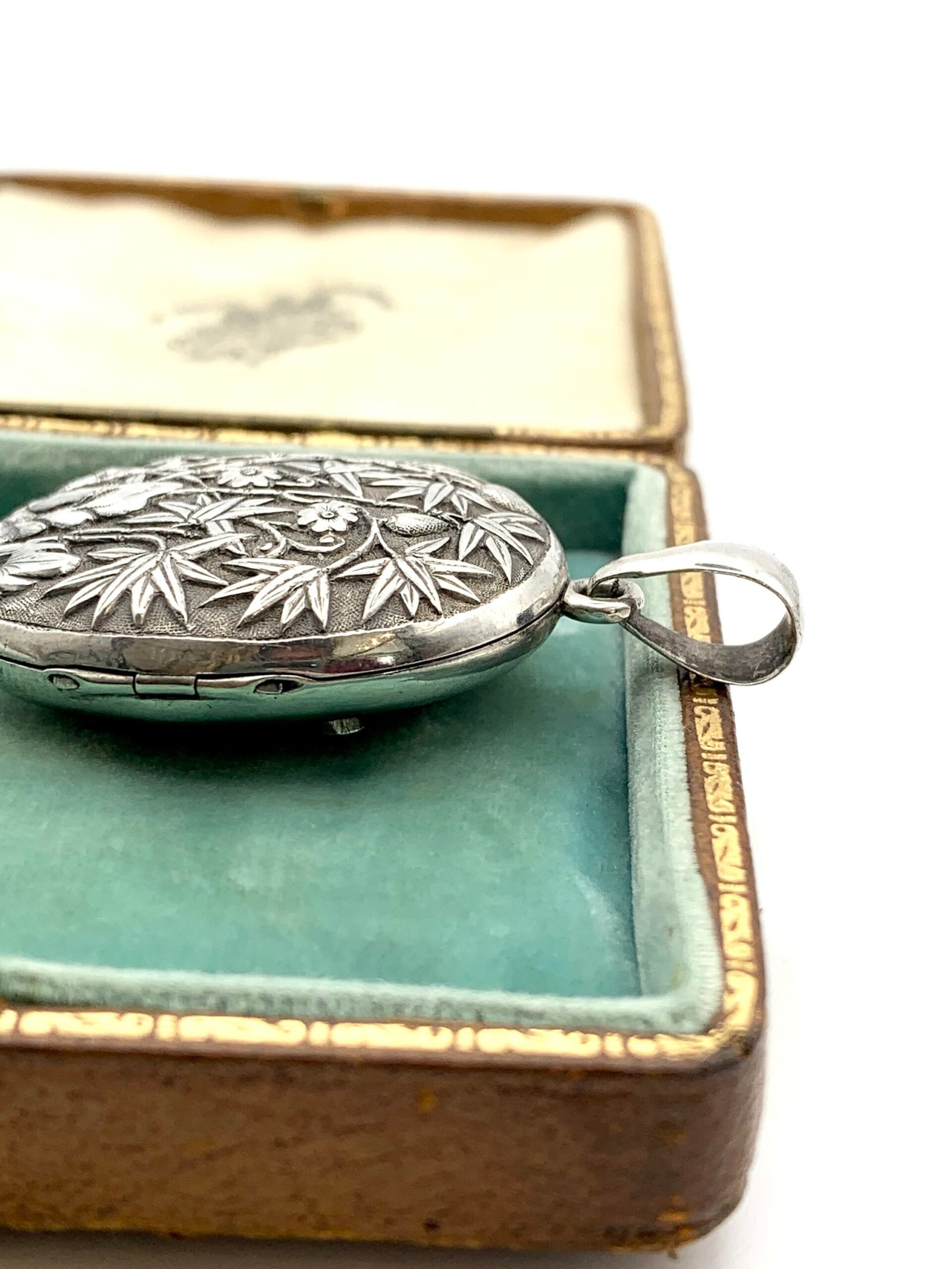 Made in the Chinoiserie style for the British market, the front of this locket is deeply carved with a traditional Chinese landscape scene