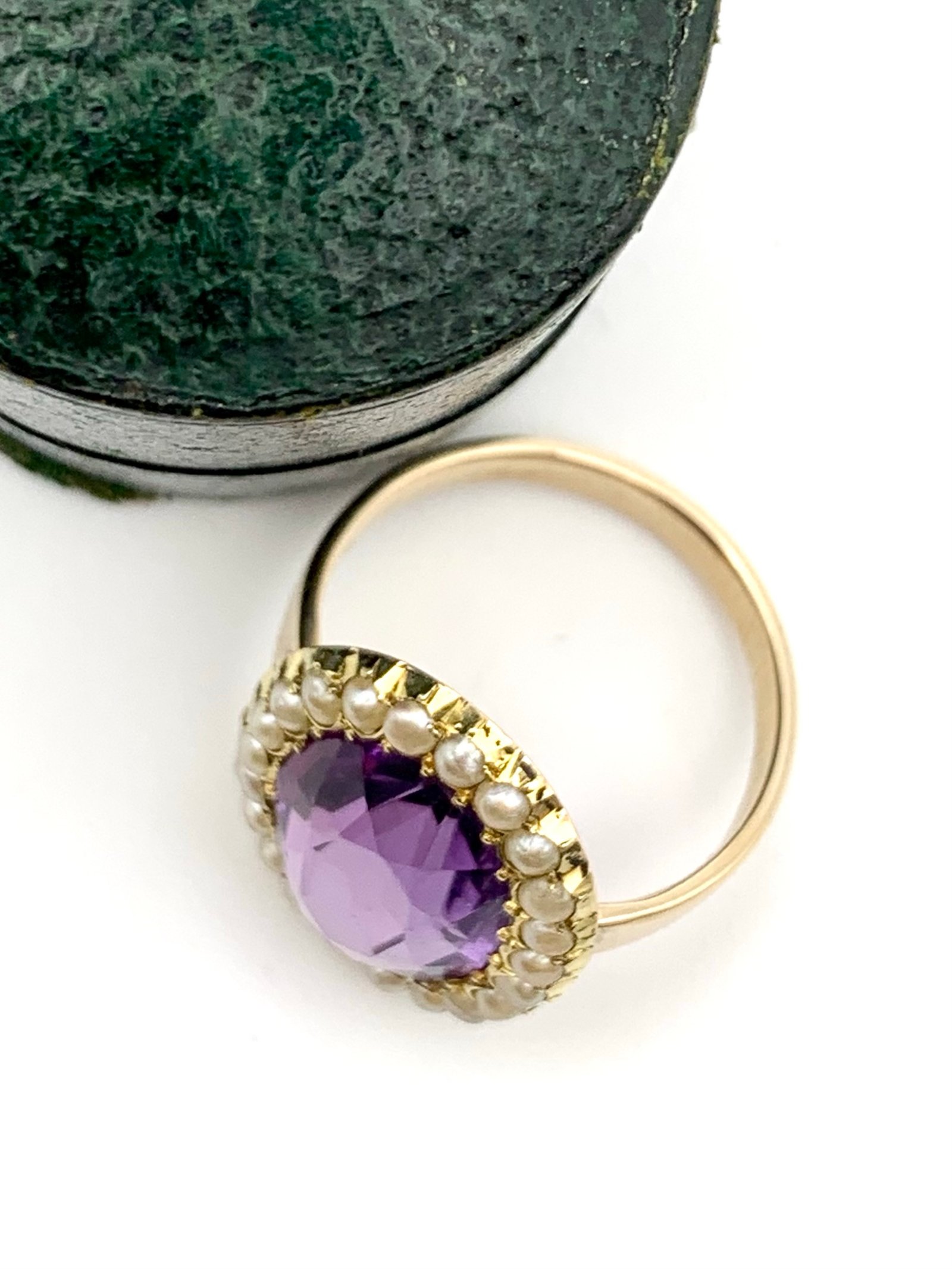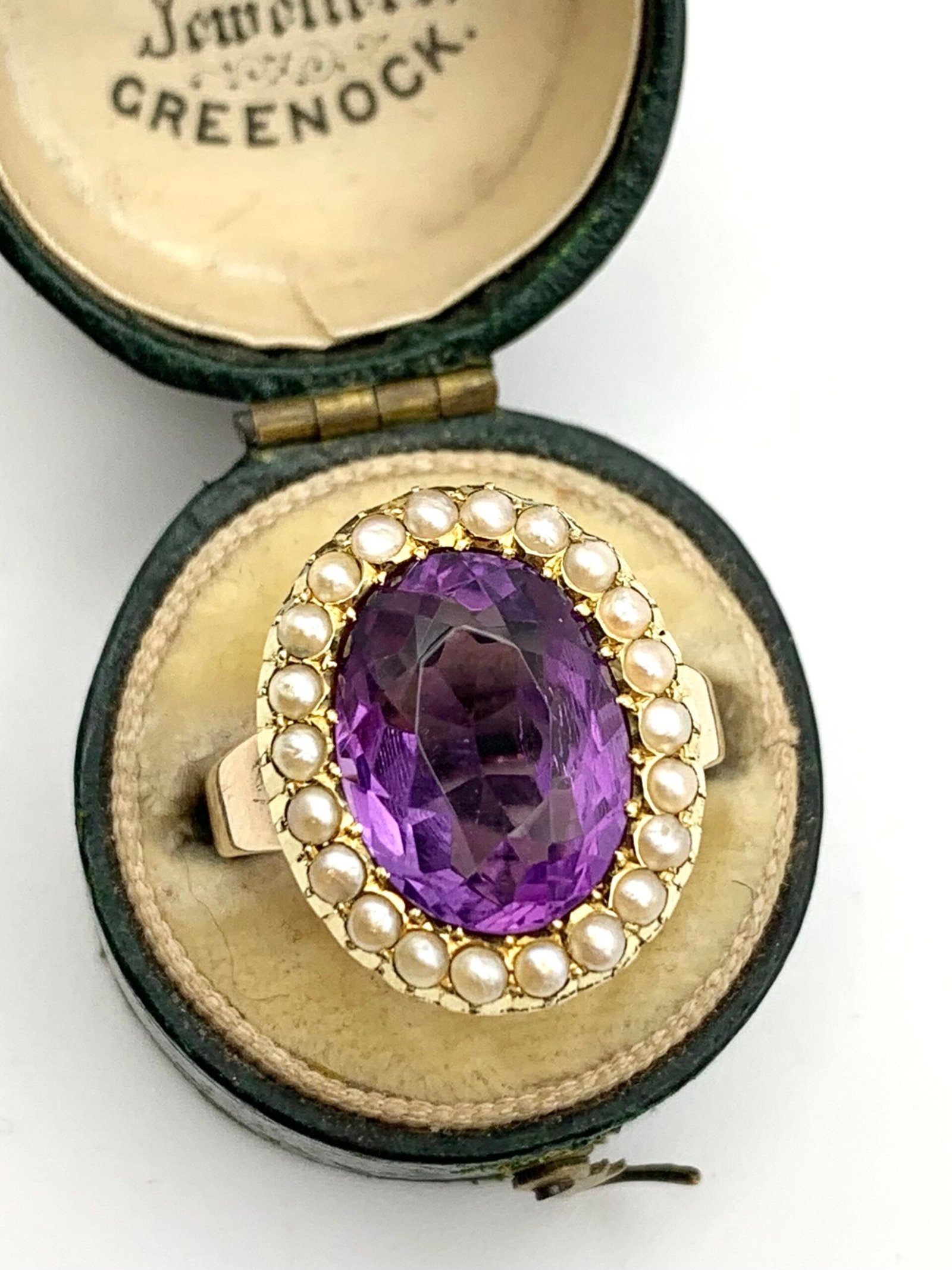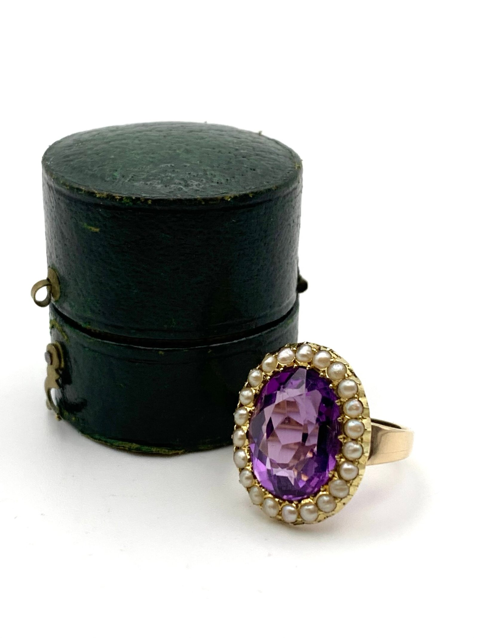 The perfect antique lace pin – c1840, 15ct gold with split natural pearls and a stunning, well saturated amethyst