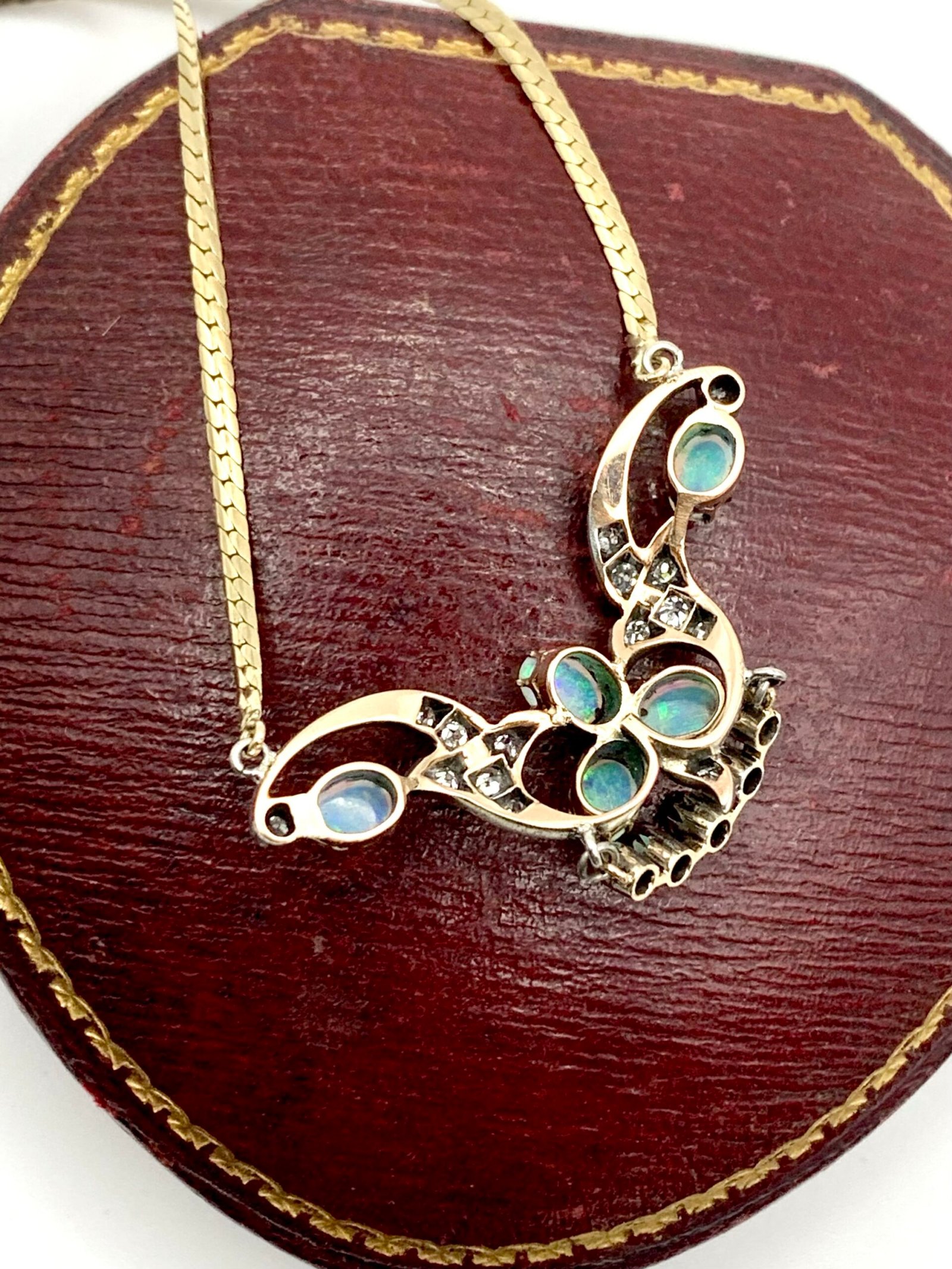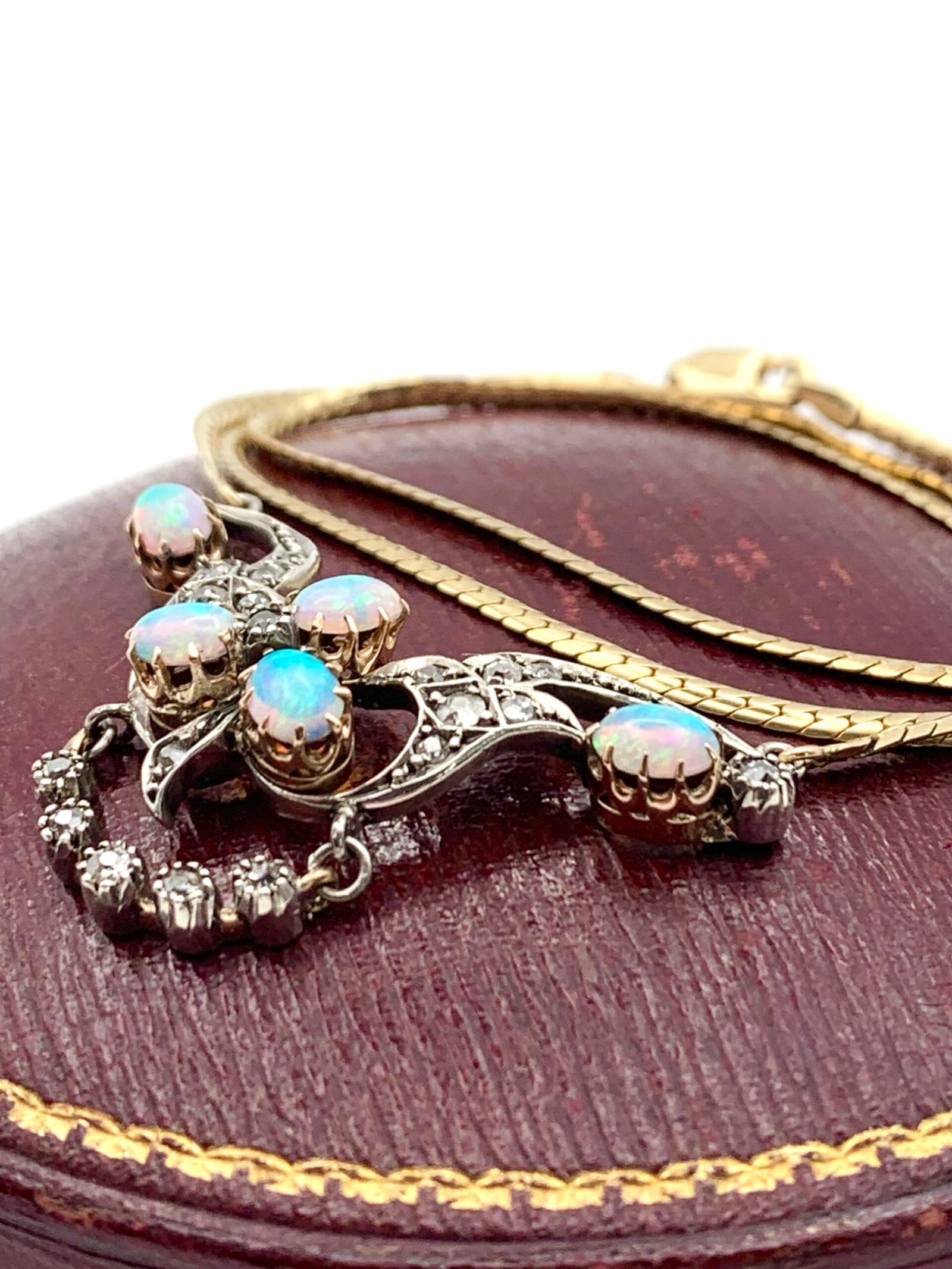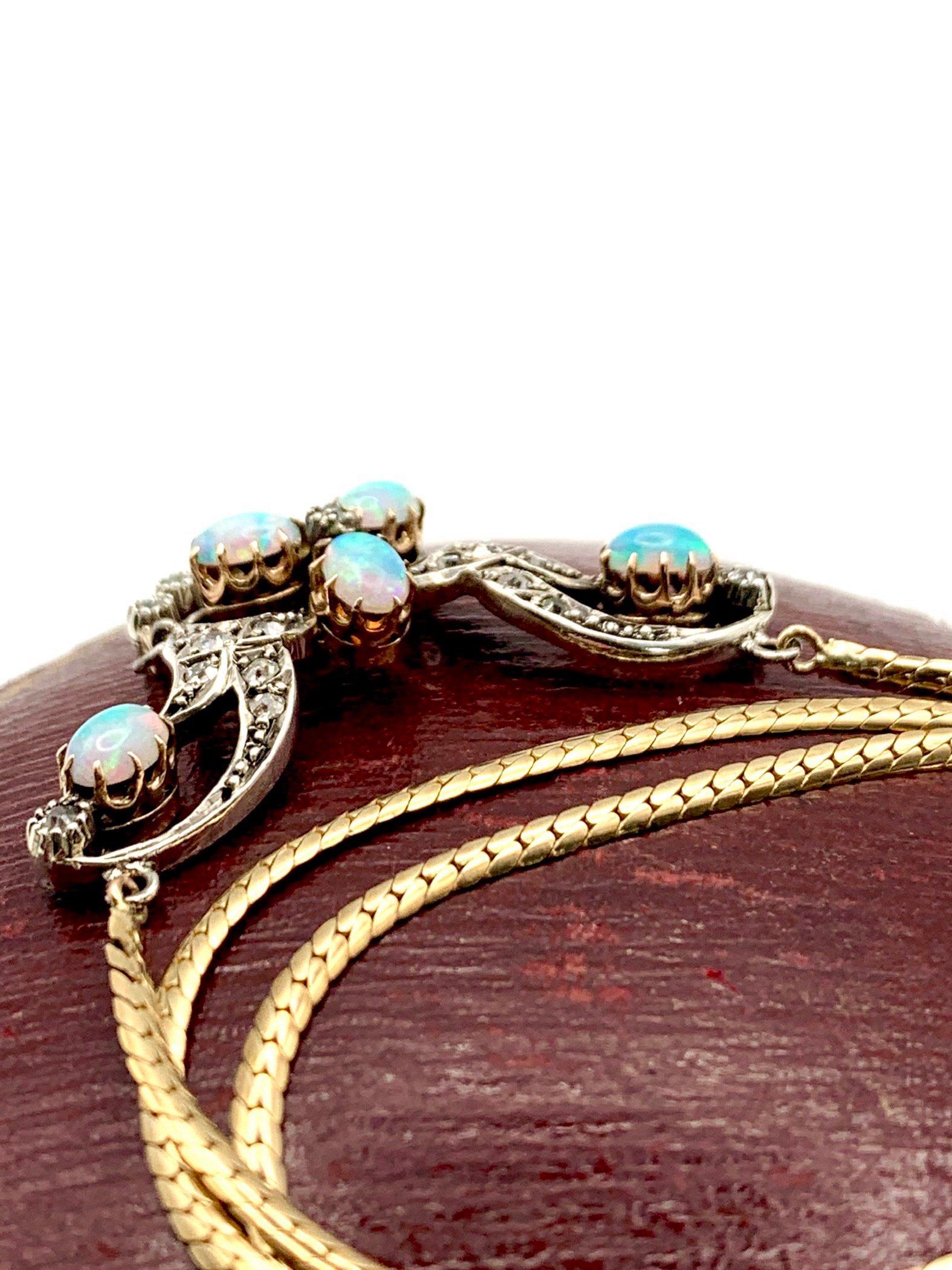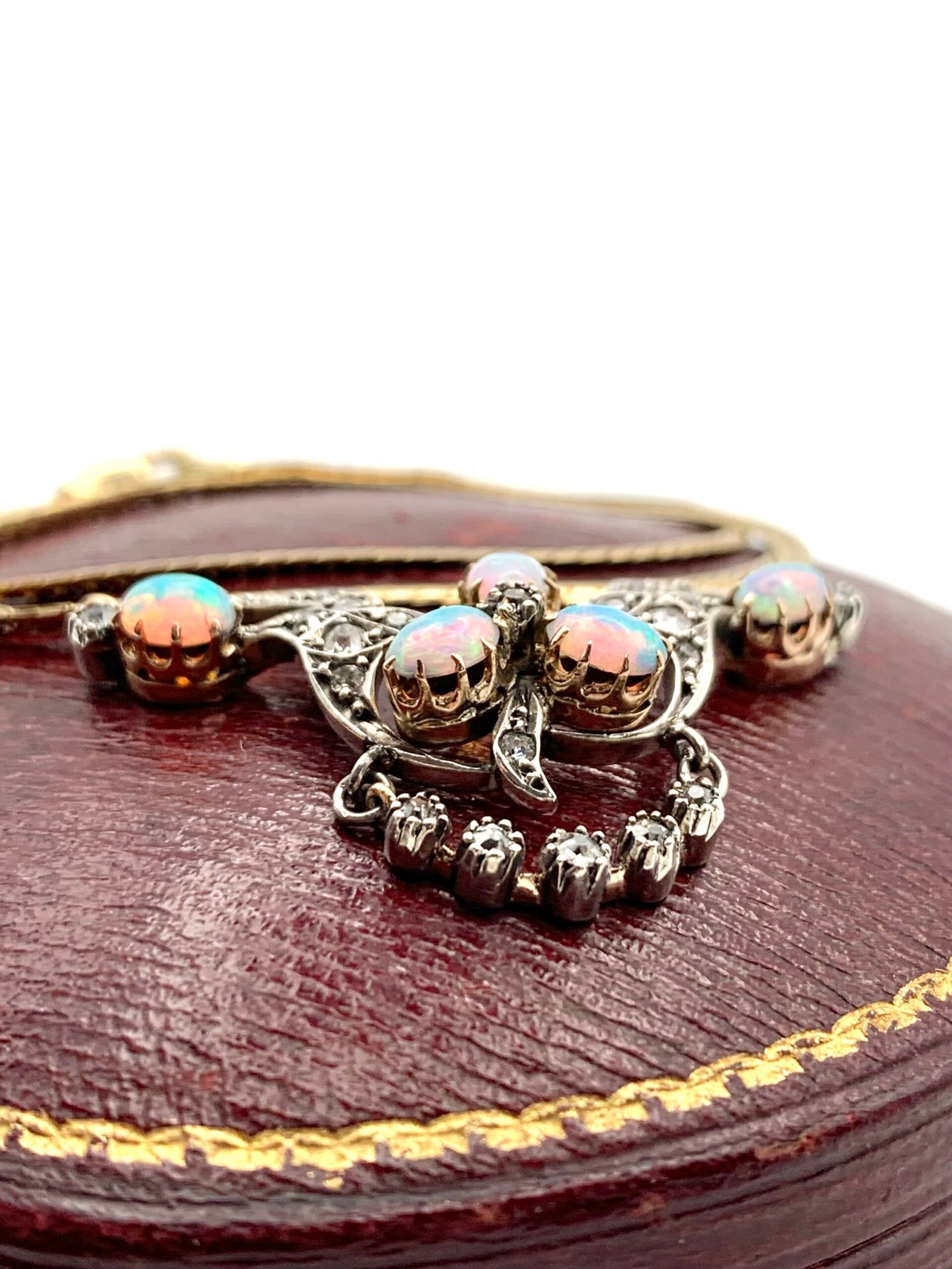 A beautiful collection of 5 natural opals, set with Old-cut diamonds, in rose-gold backed silver