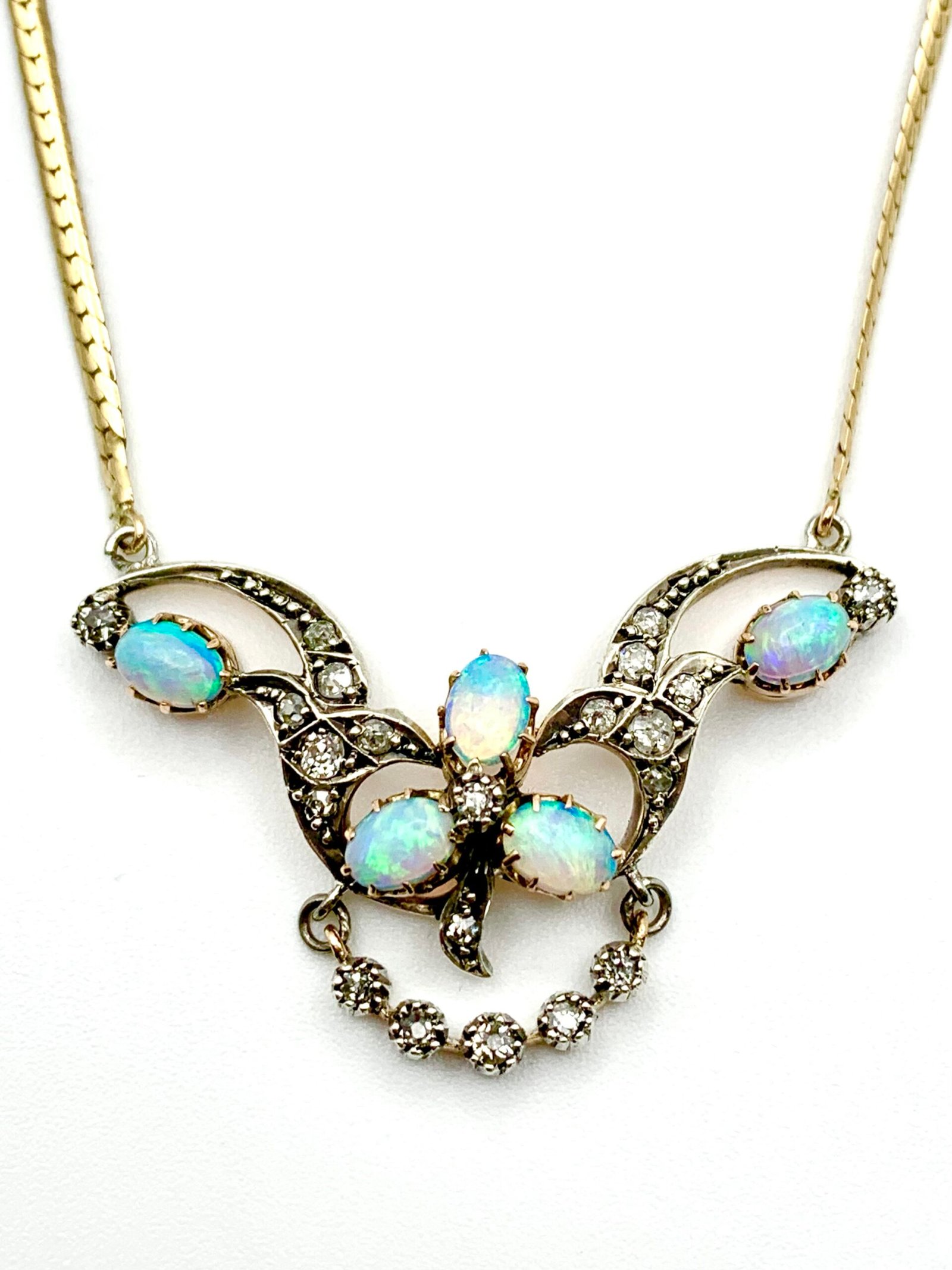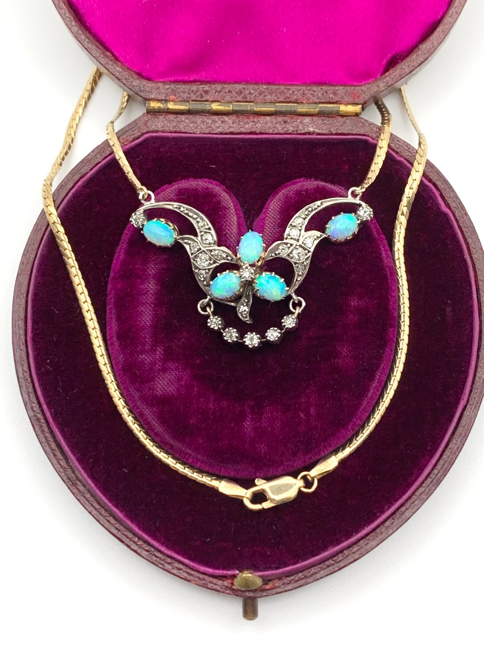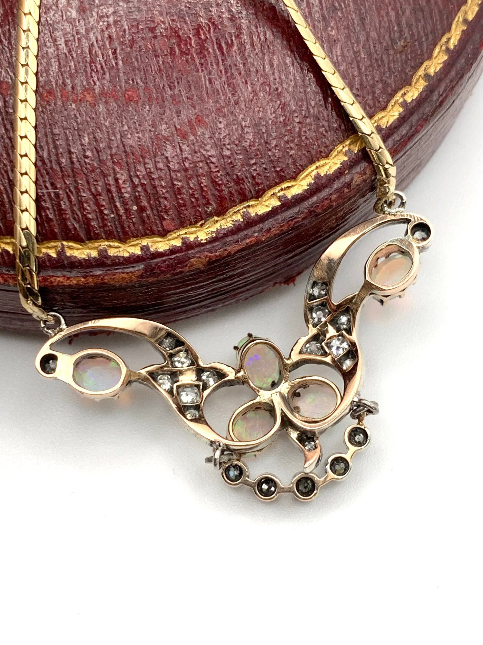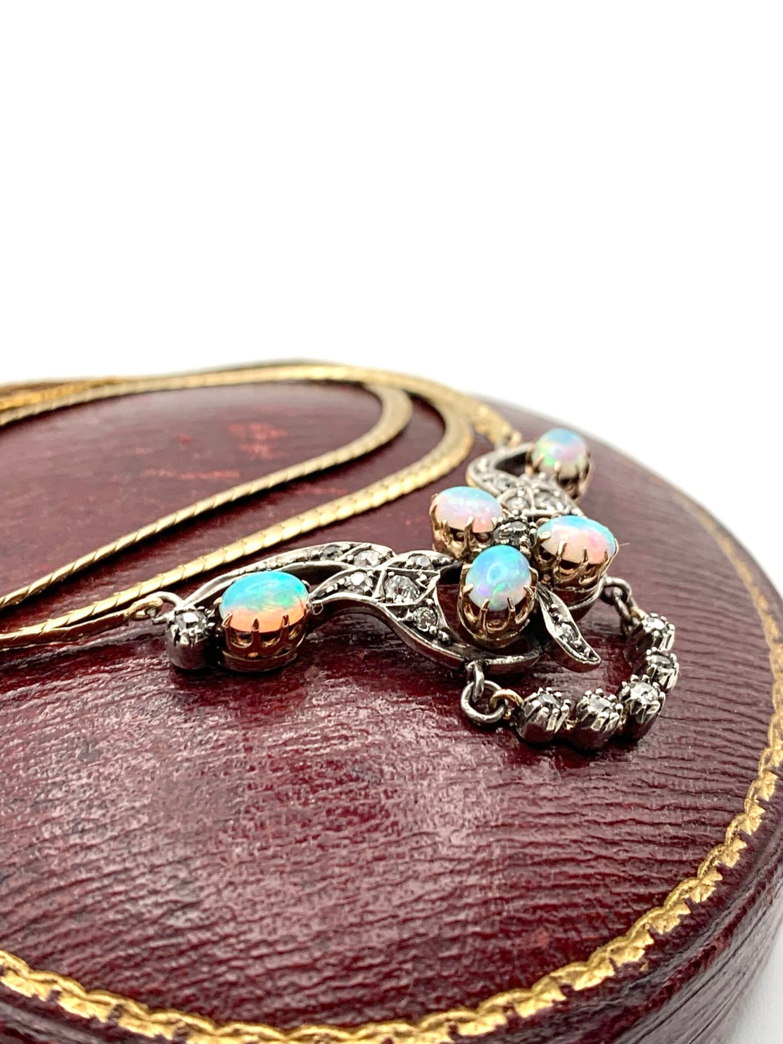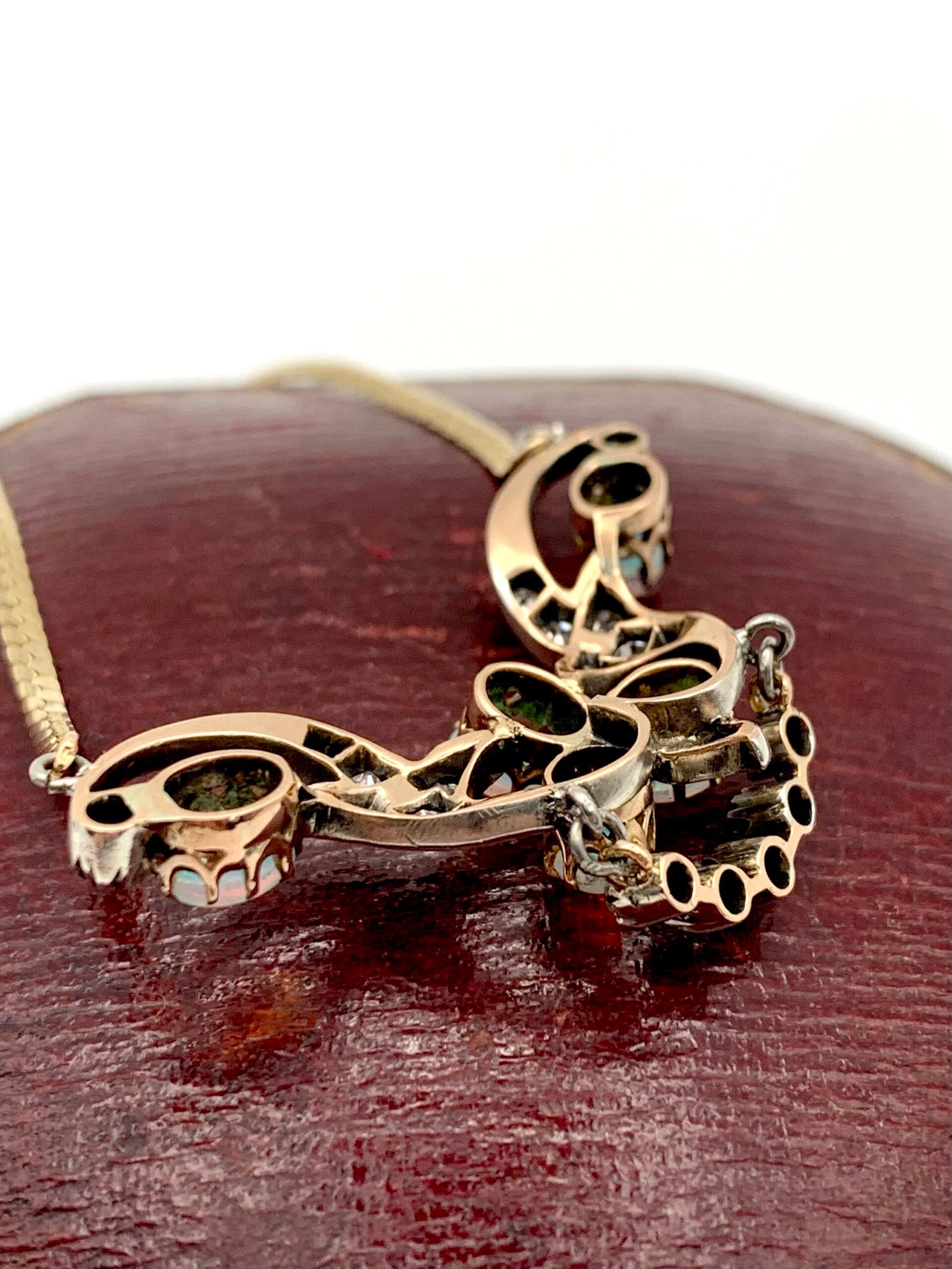 A beautiful collection of 5 natural opals, set with Old-cut diamonds, in rose-gold backed silver