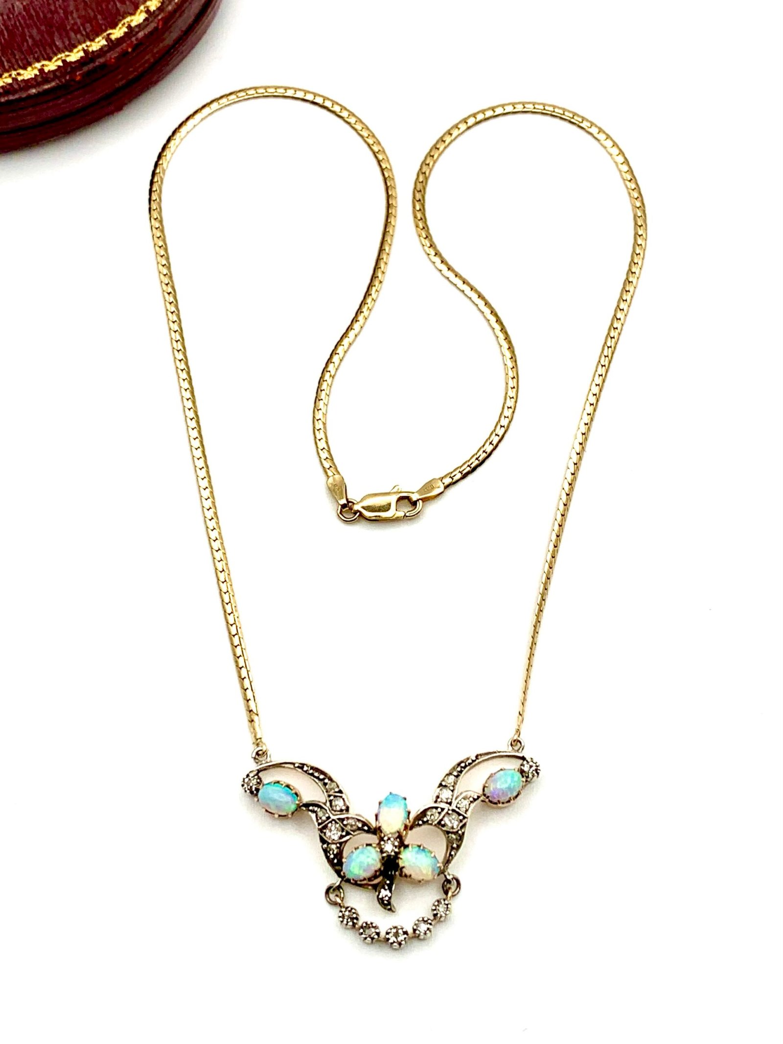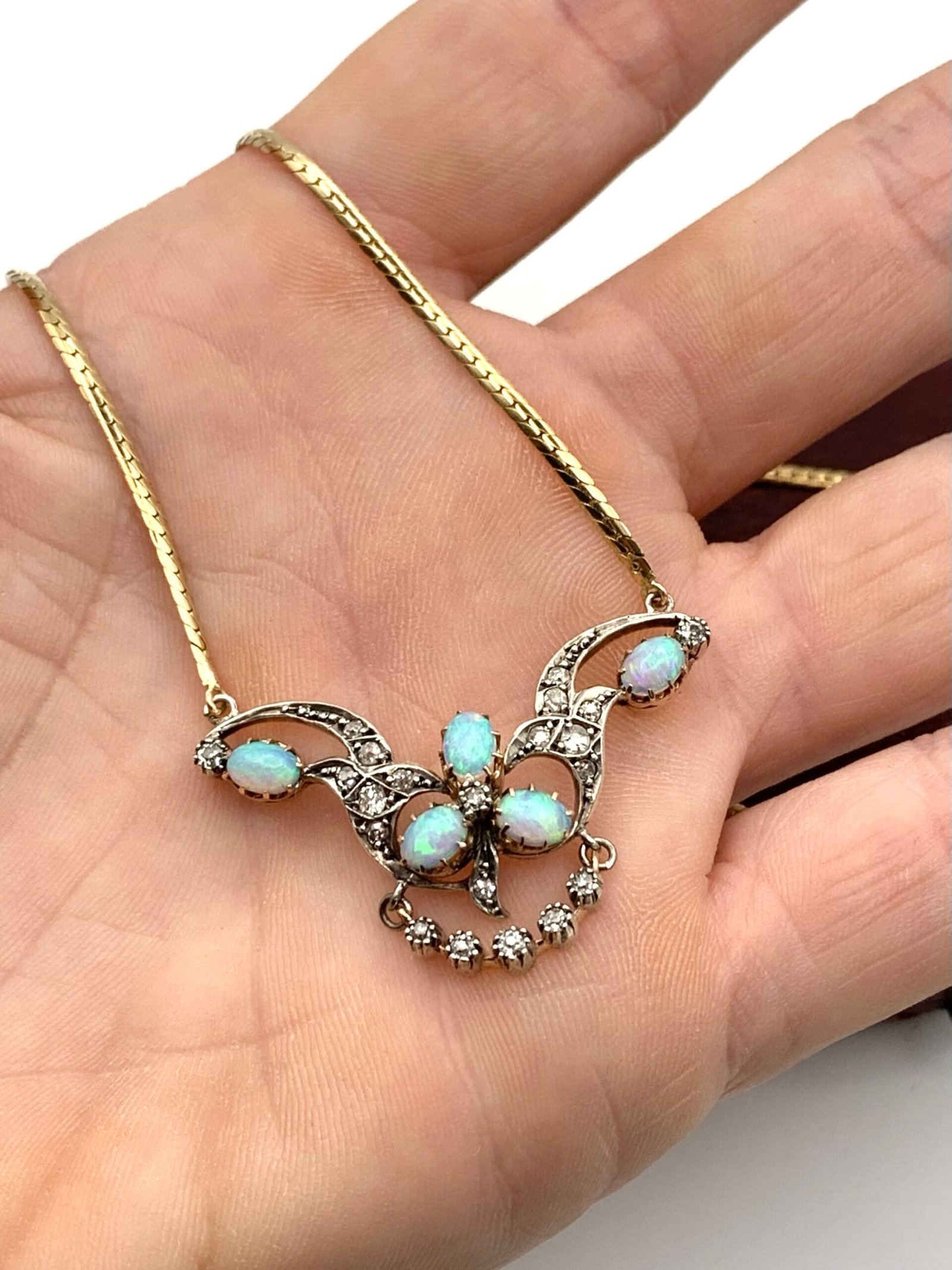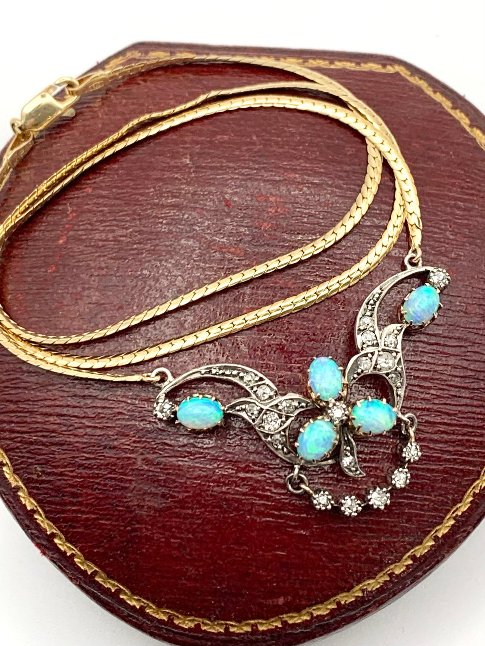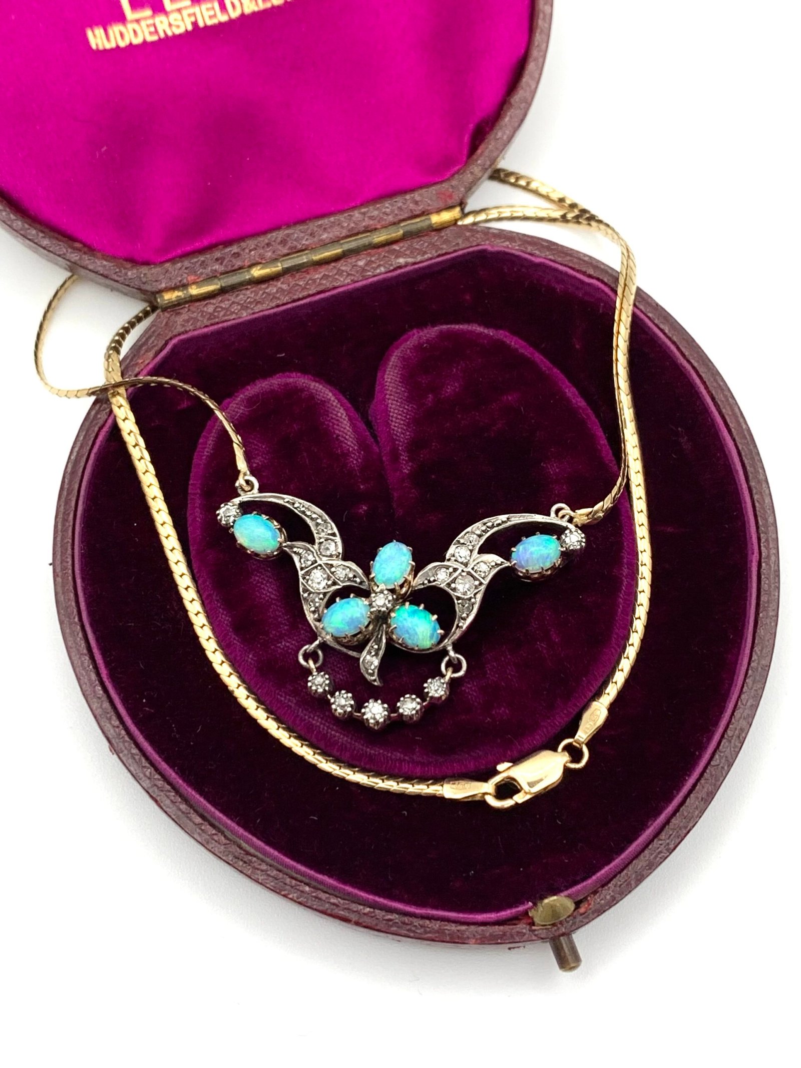 A beautiful collection of 5 natural opals, set with Old-cut diamonds, in rose-gold backed silver