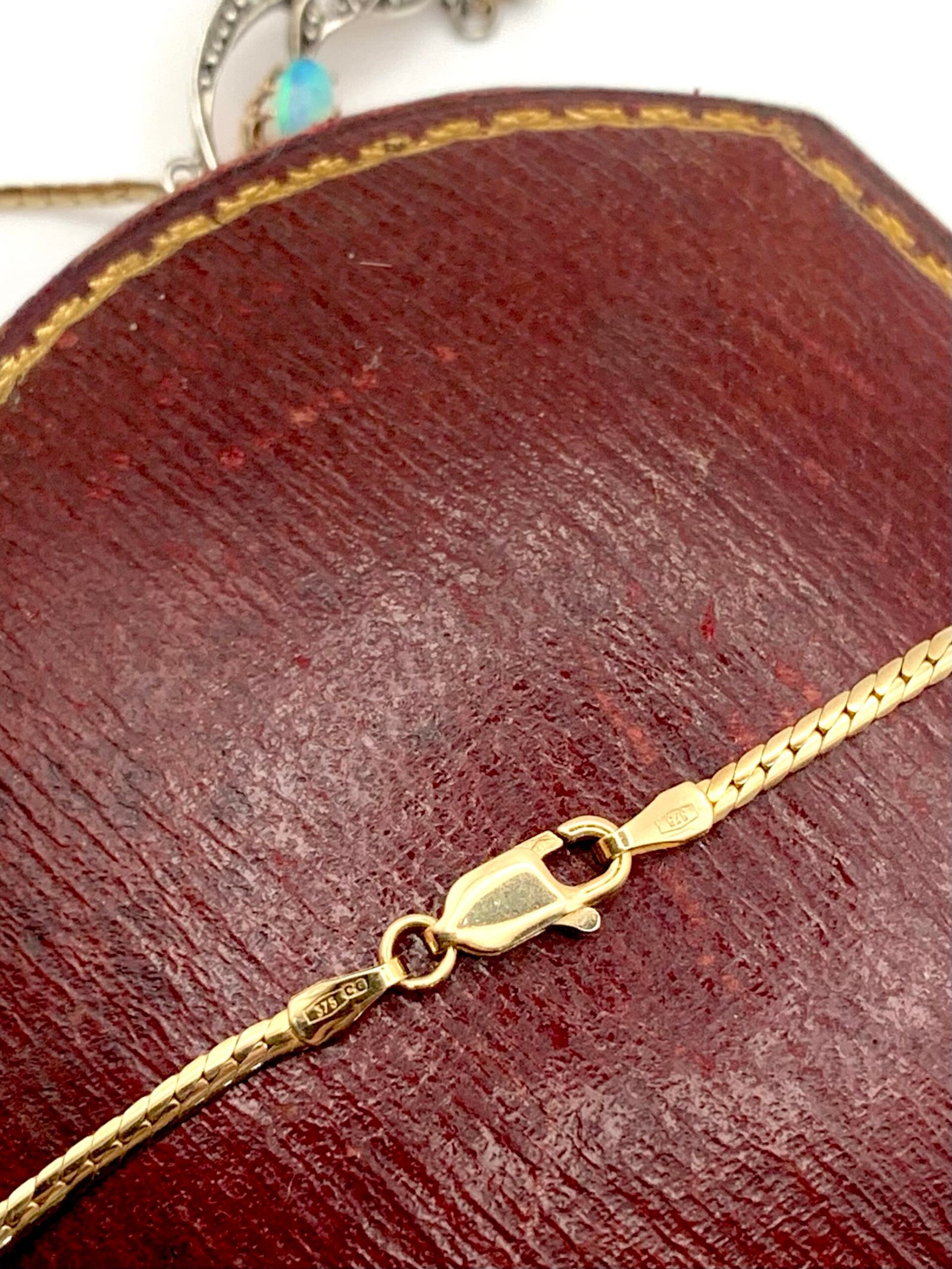The front of the necklace – originally a brooch – hangs from a 9ct yellow gold, flattened curb chain