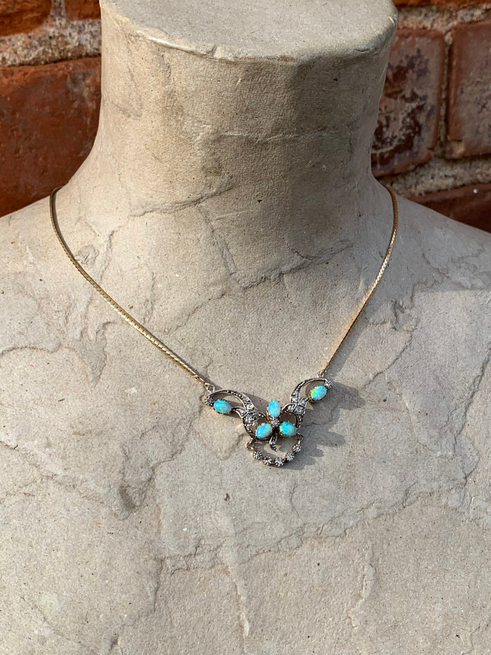 The cabochon opals are claw set in gold, the diamonds sit flush in the silver