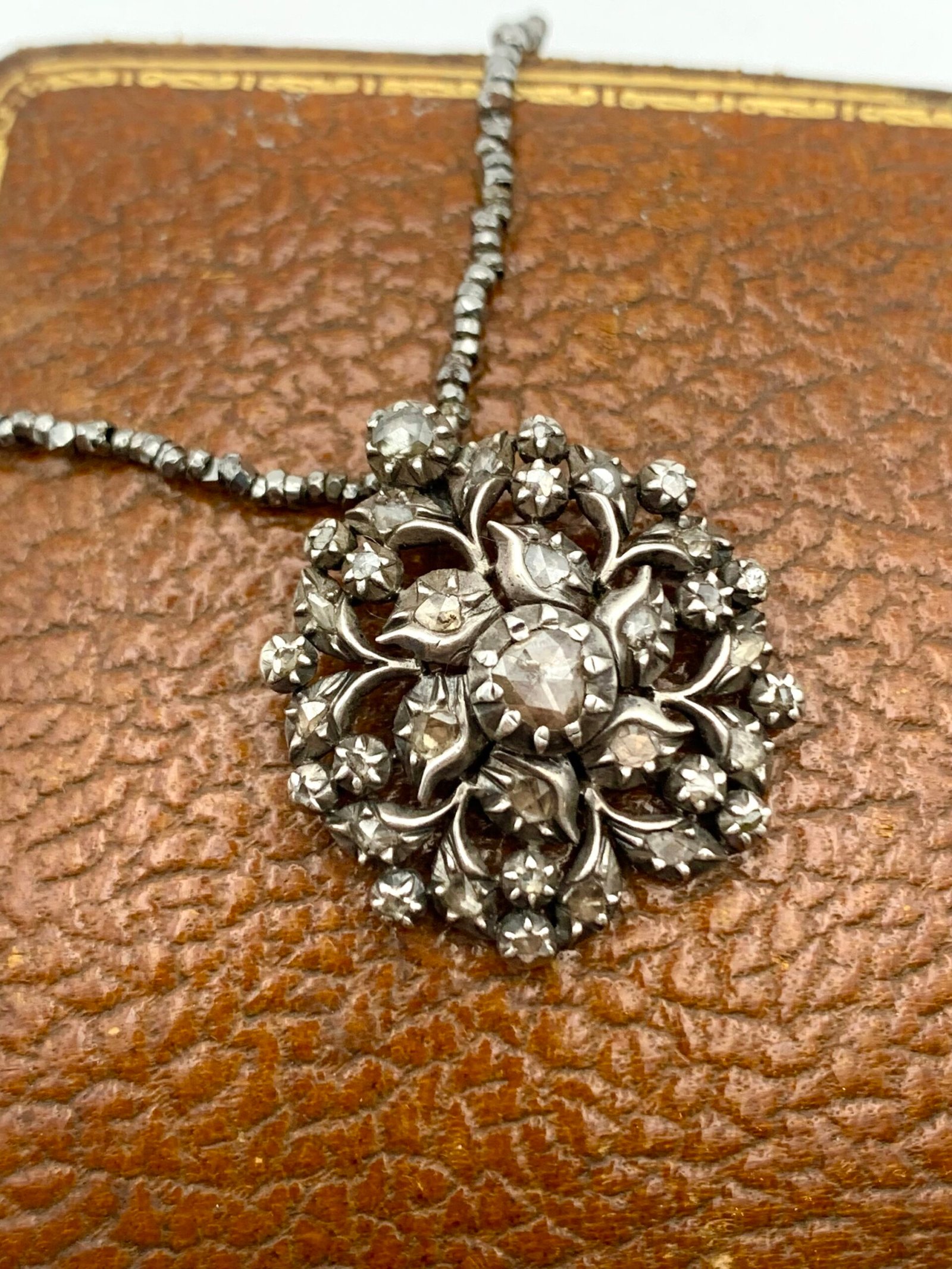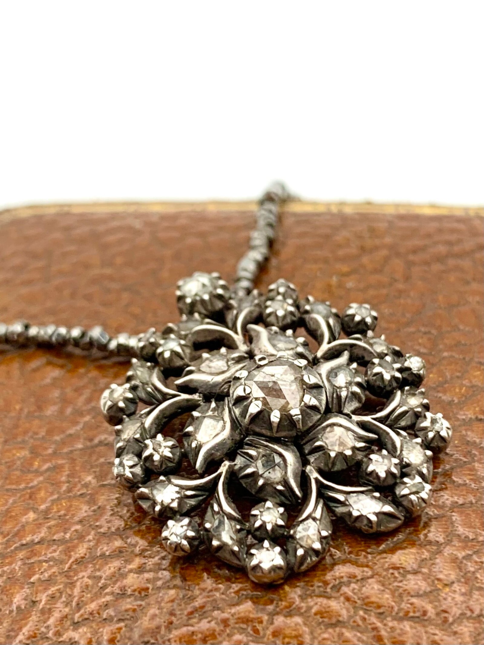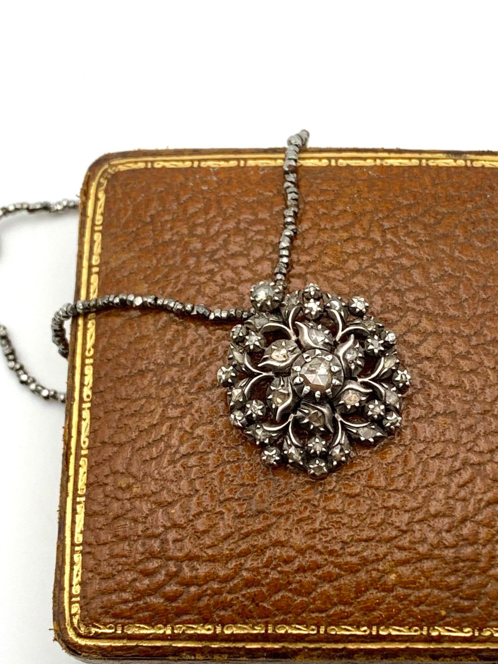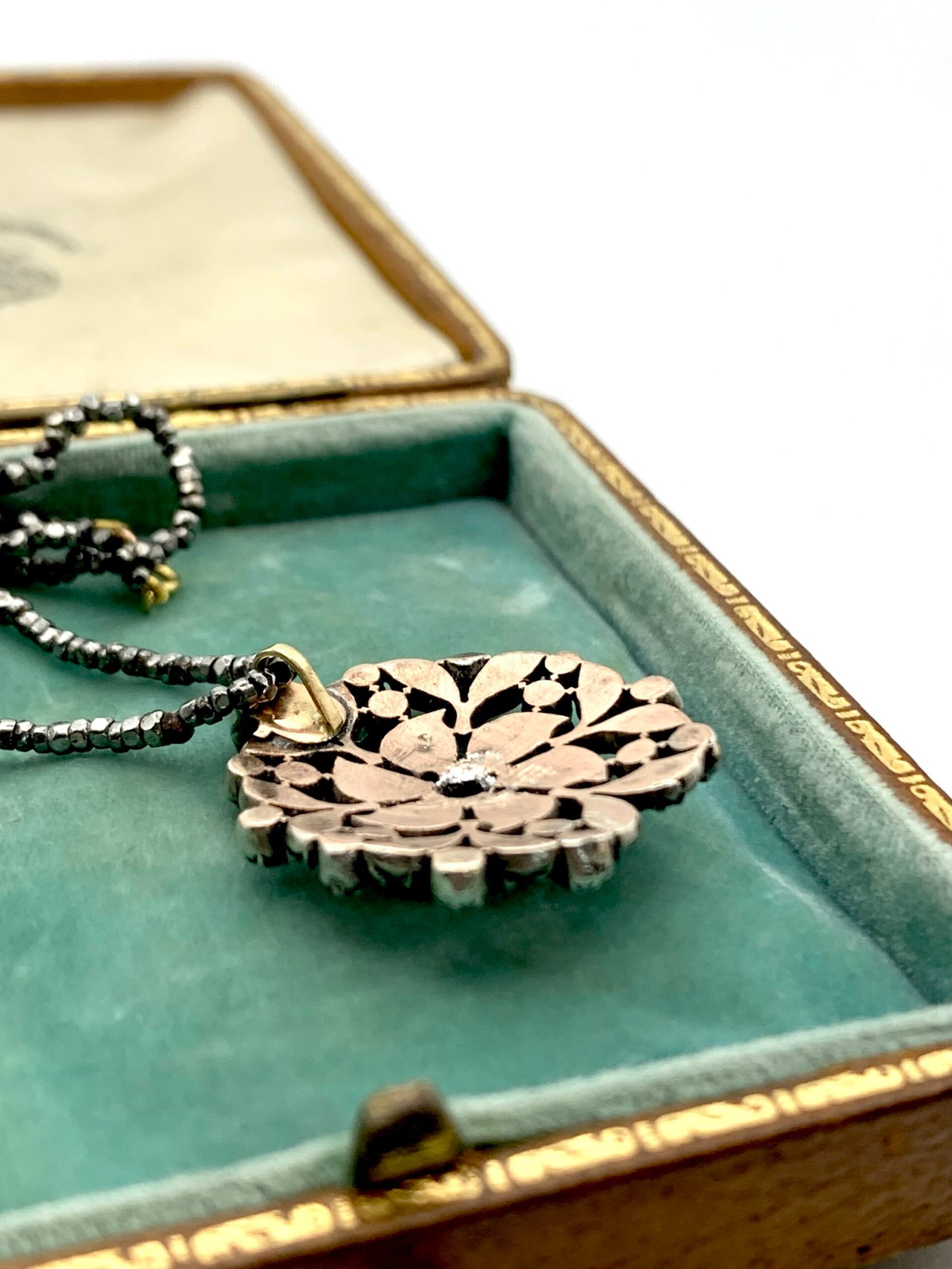 The pendant hangs from a string of small, faceted, antique steel beads.