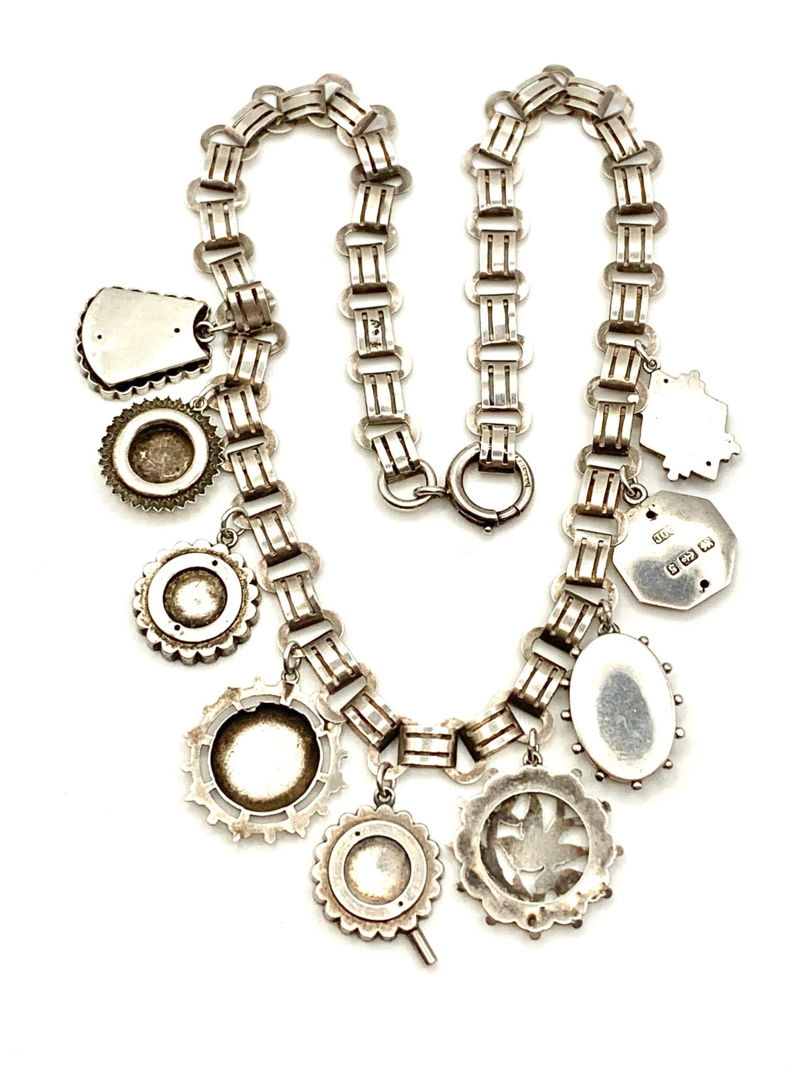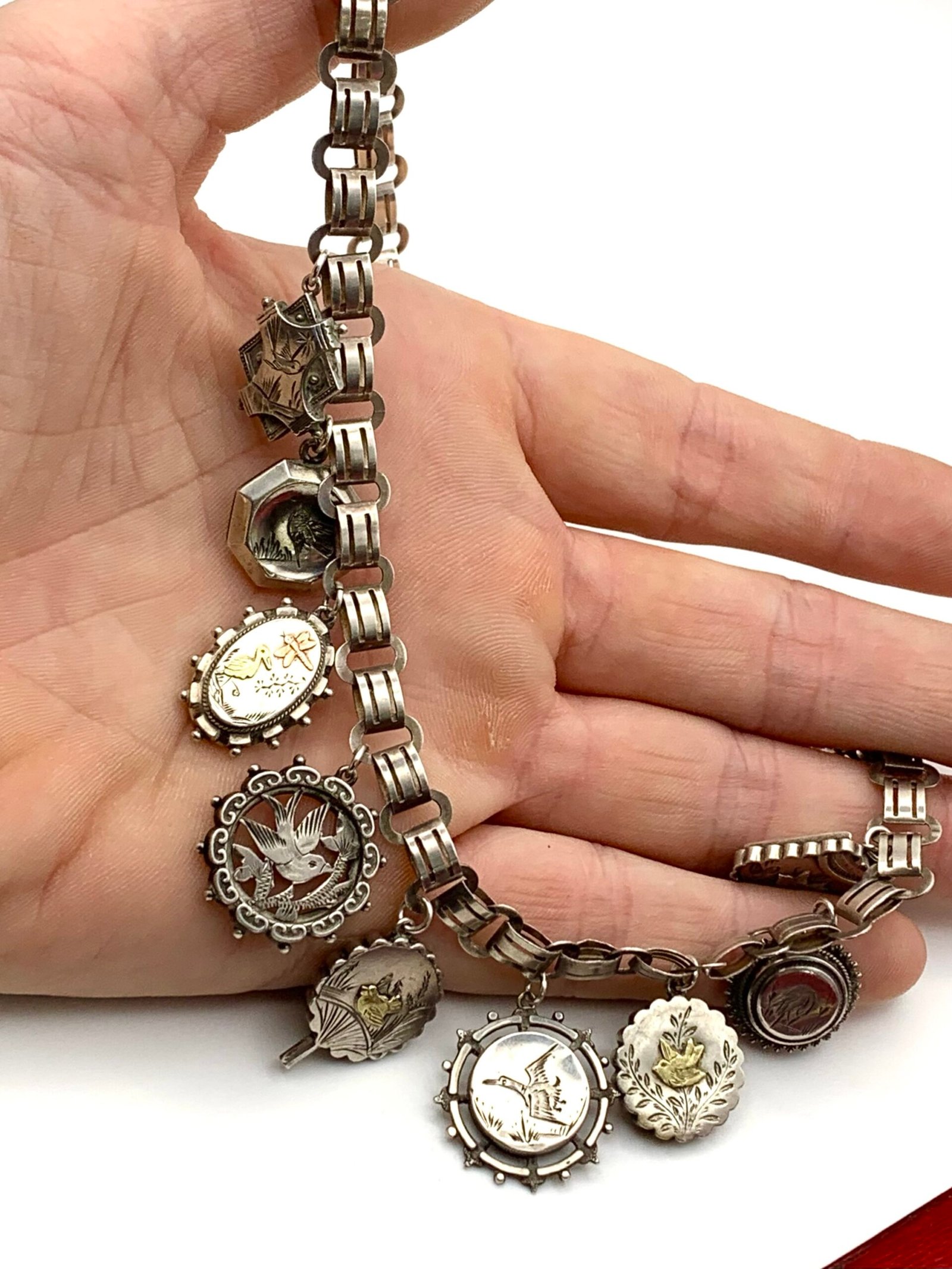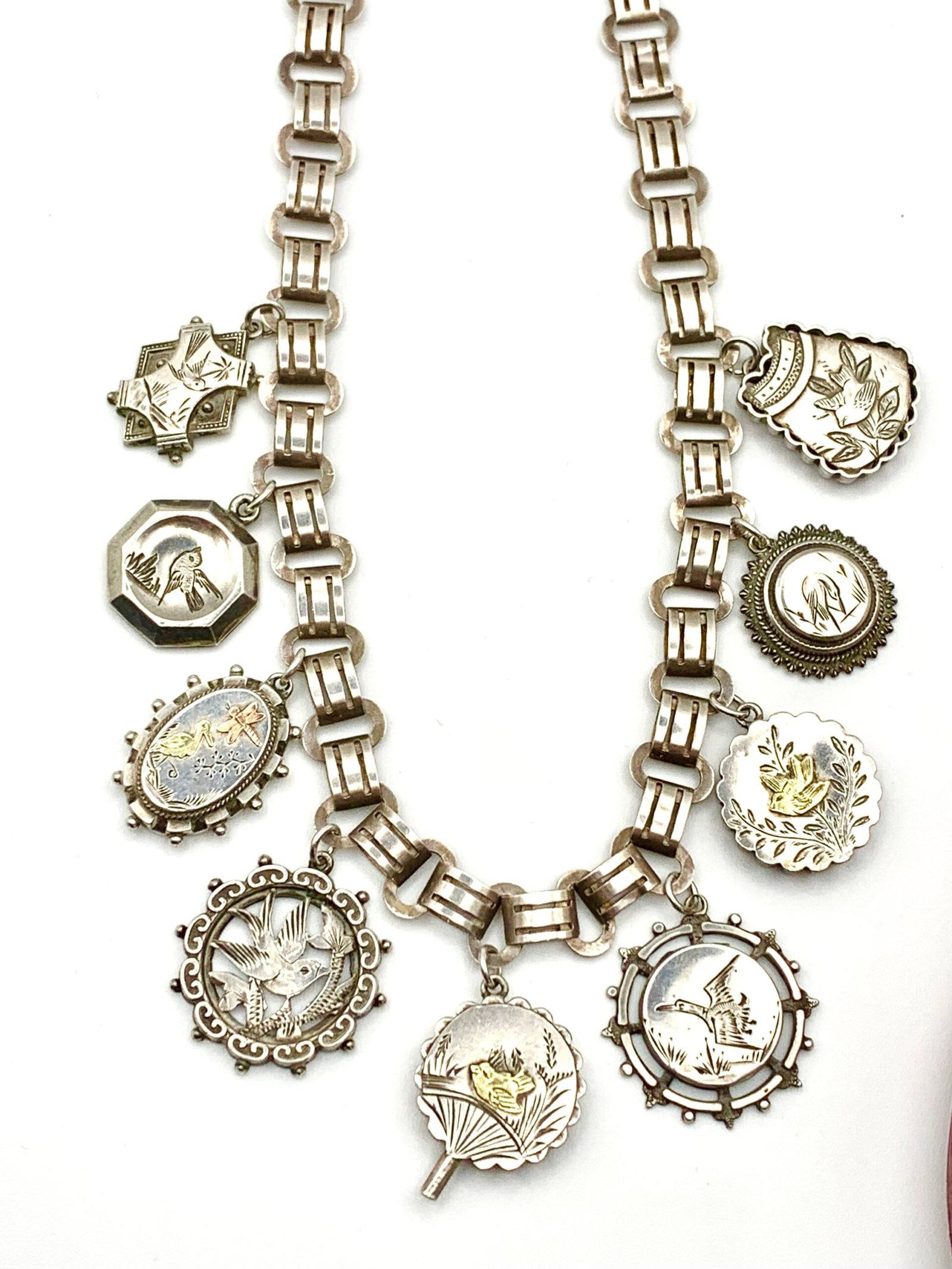 They hang from a 19th century silver locket collar that is remarkably modern in design