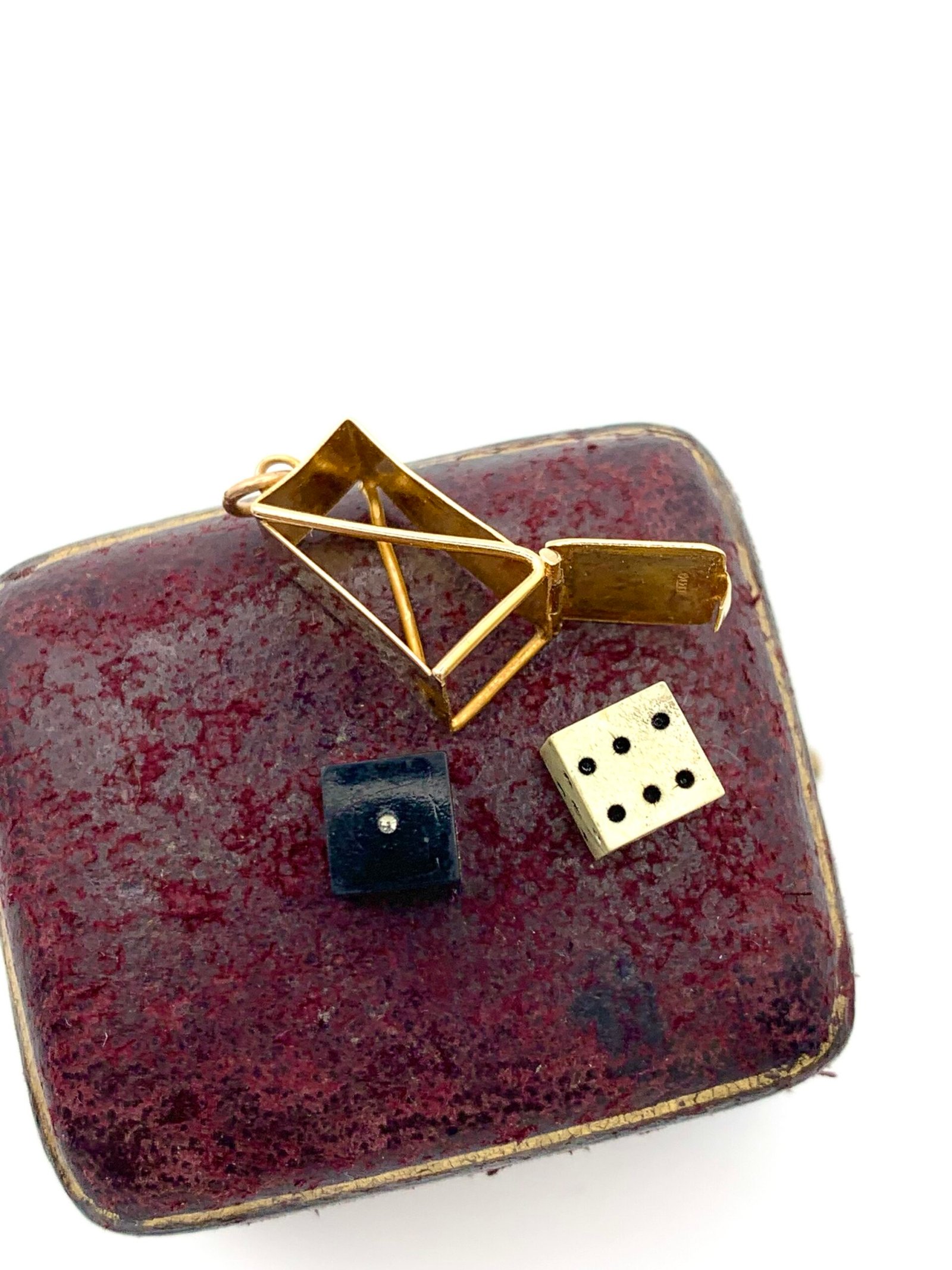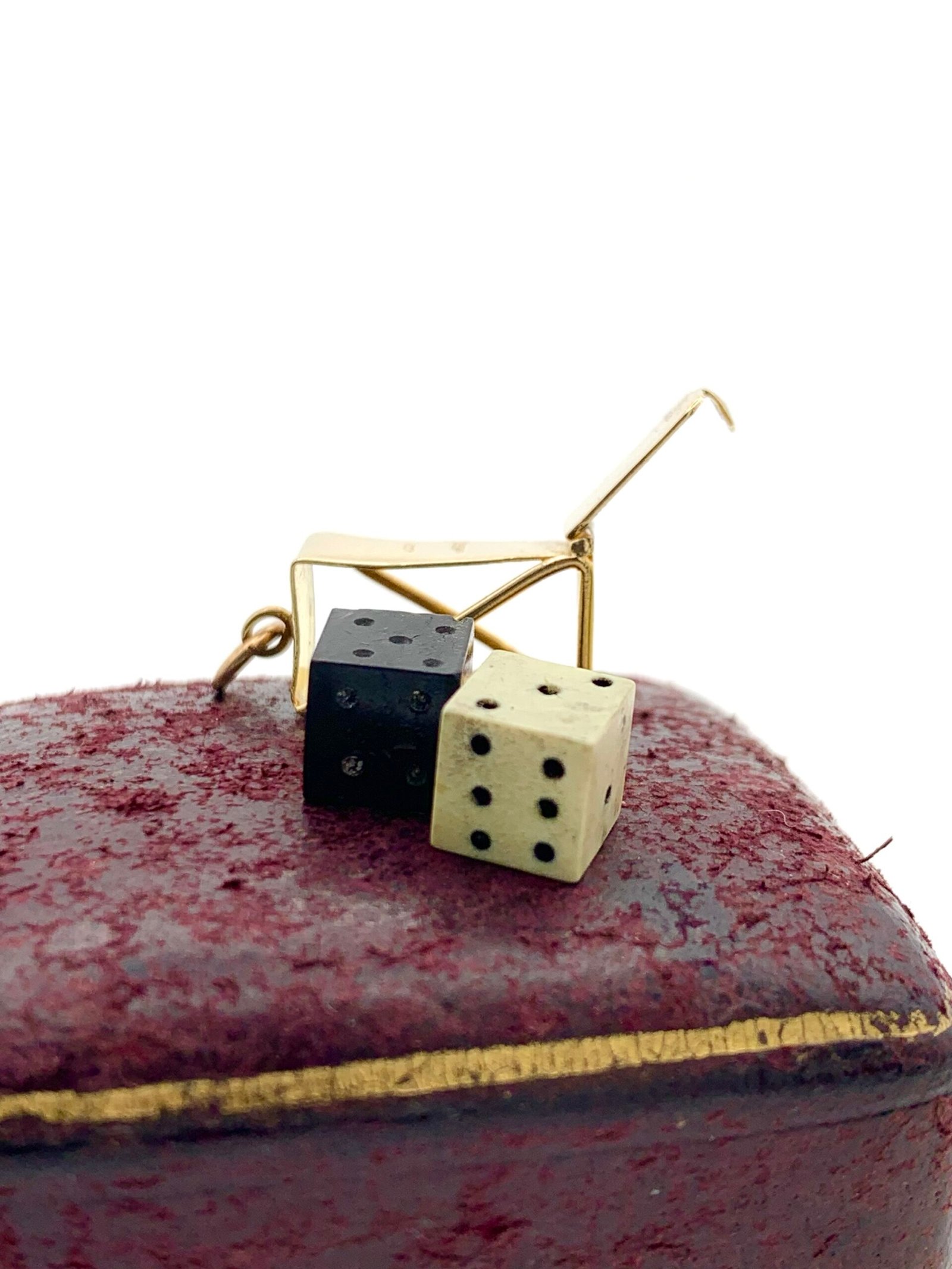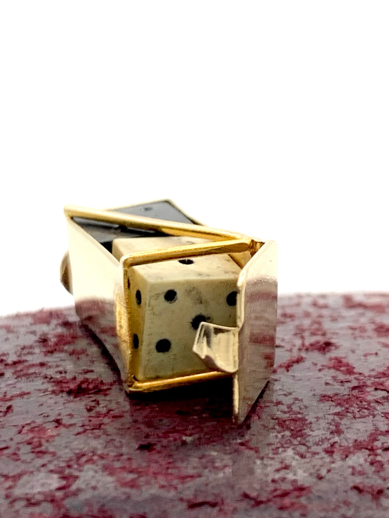 Inside the gold case are two small dice, one black and one white