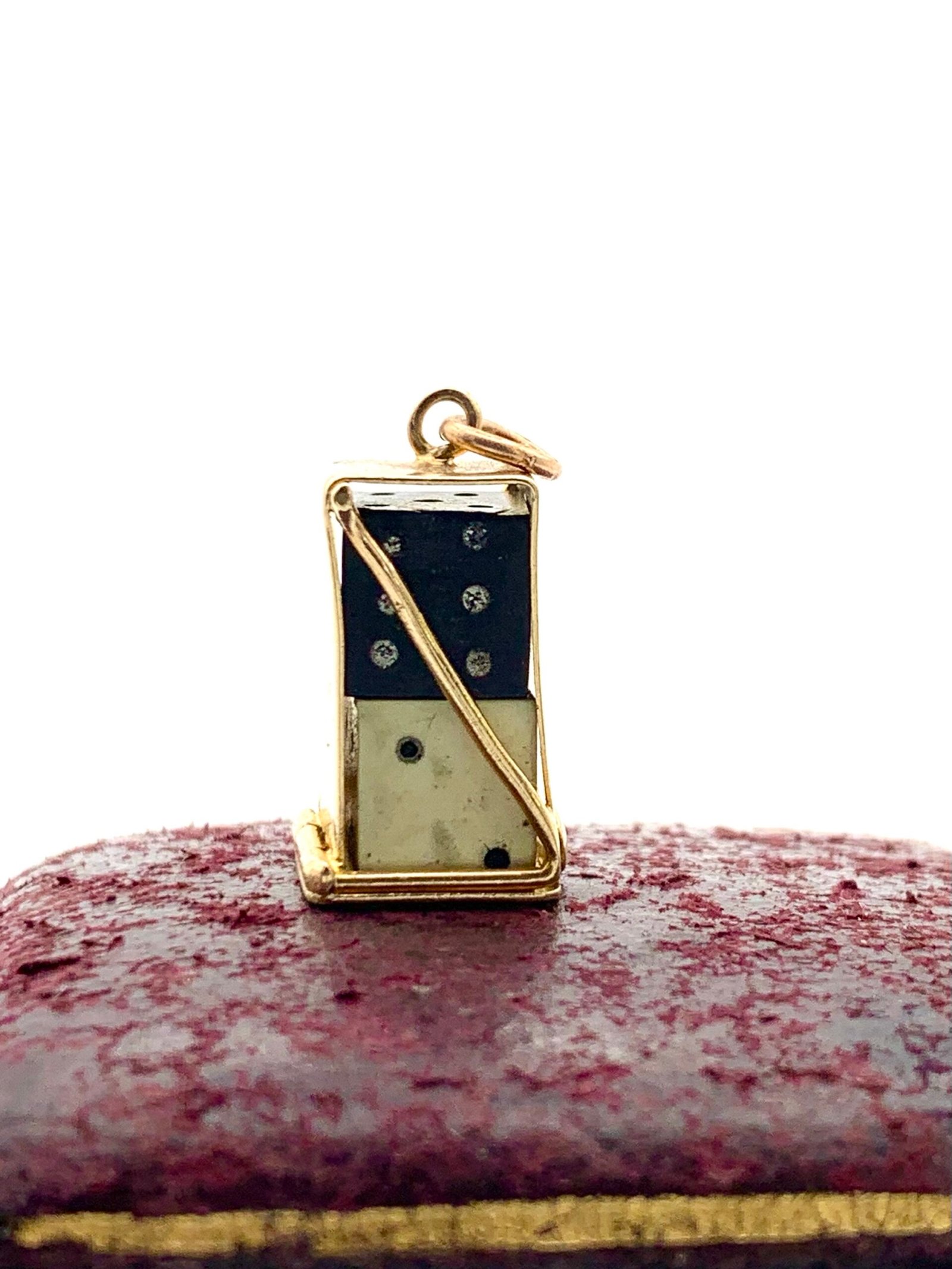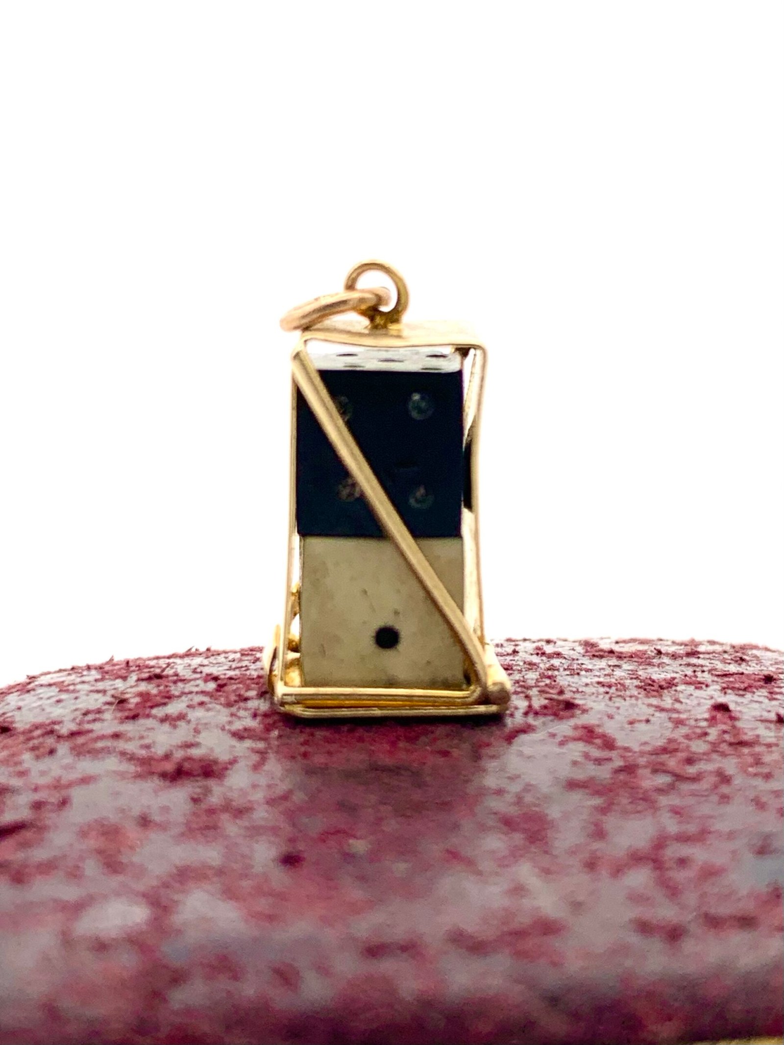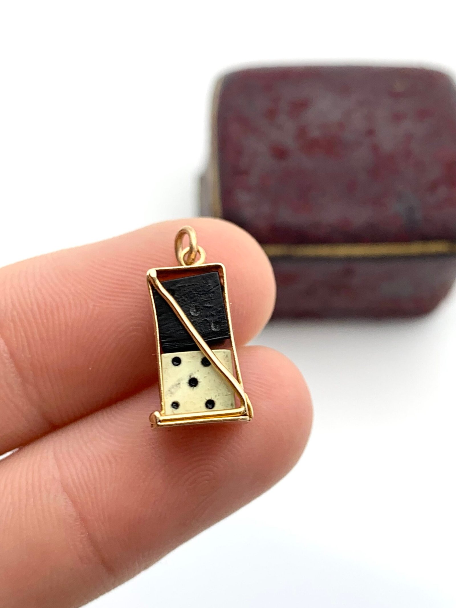 Inside the gold case are two small dice, one black and one white